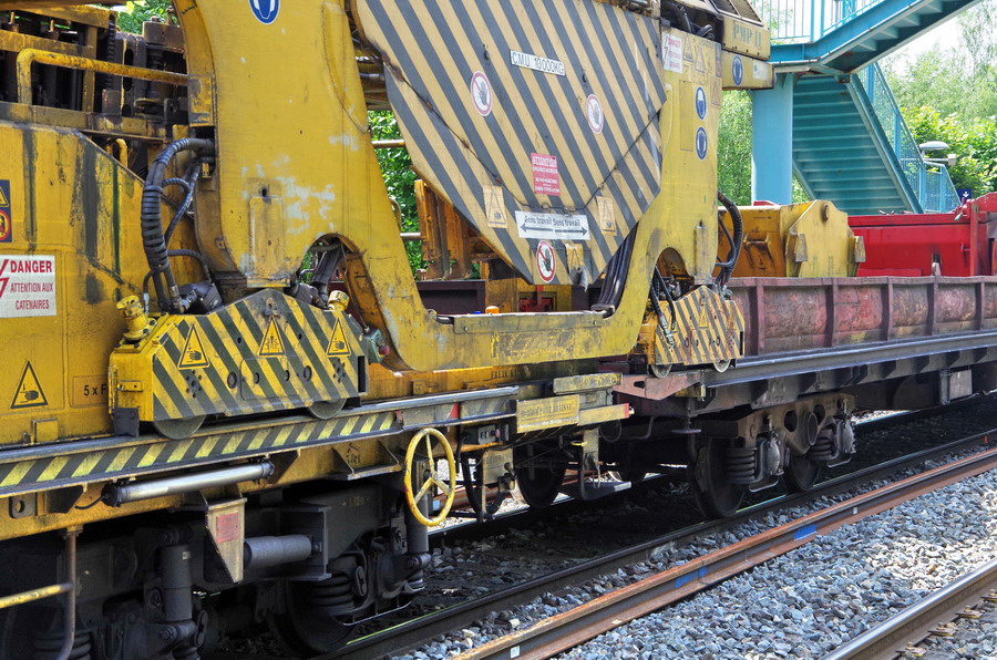 le wagon 80 87 976 7 101-9 Ua R00 5 F SNCF-PSL ramassage et distribution d'agrès avec un des 2 PMP (Portique de manutention des palettes de traverses)
