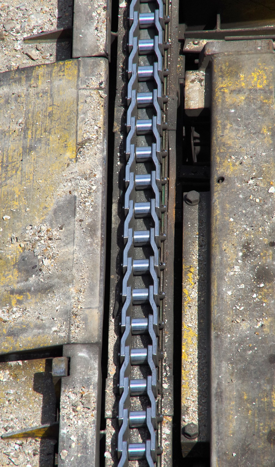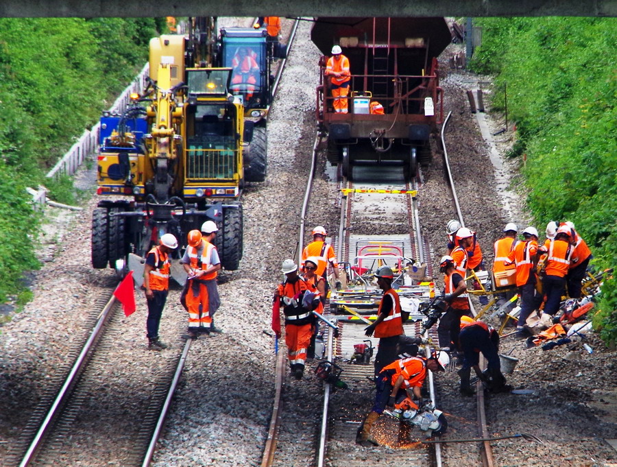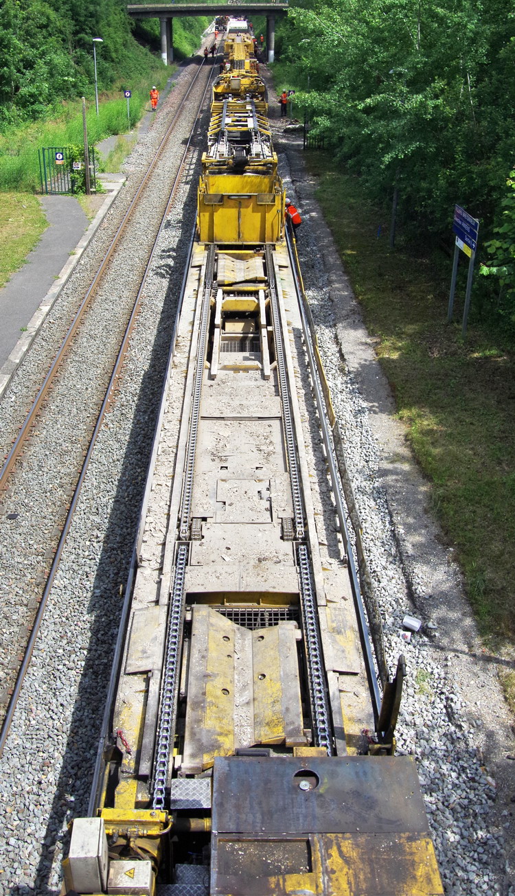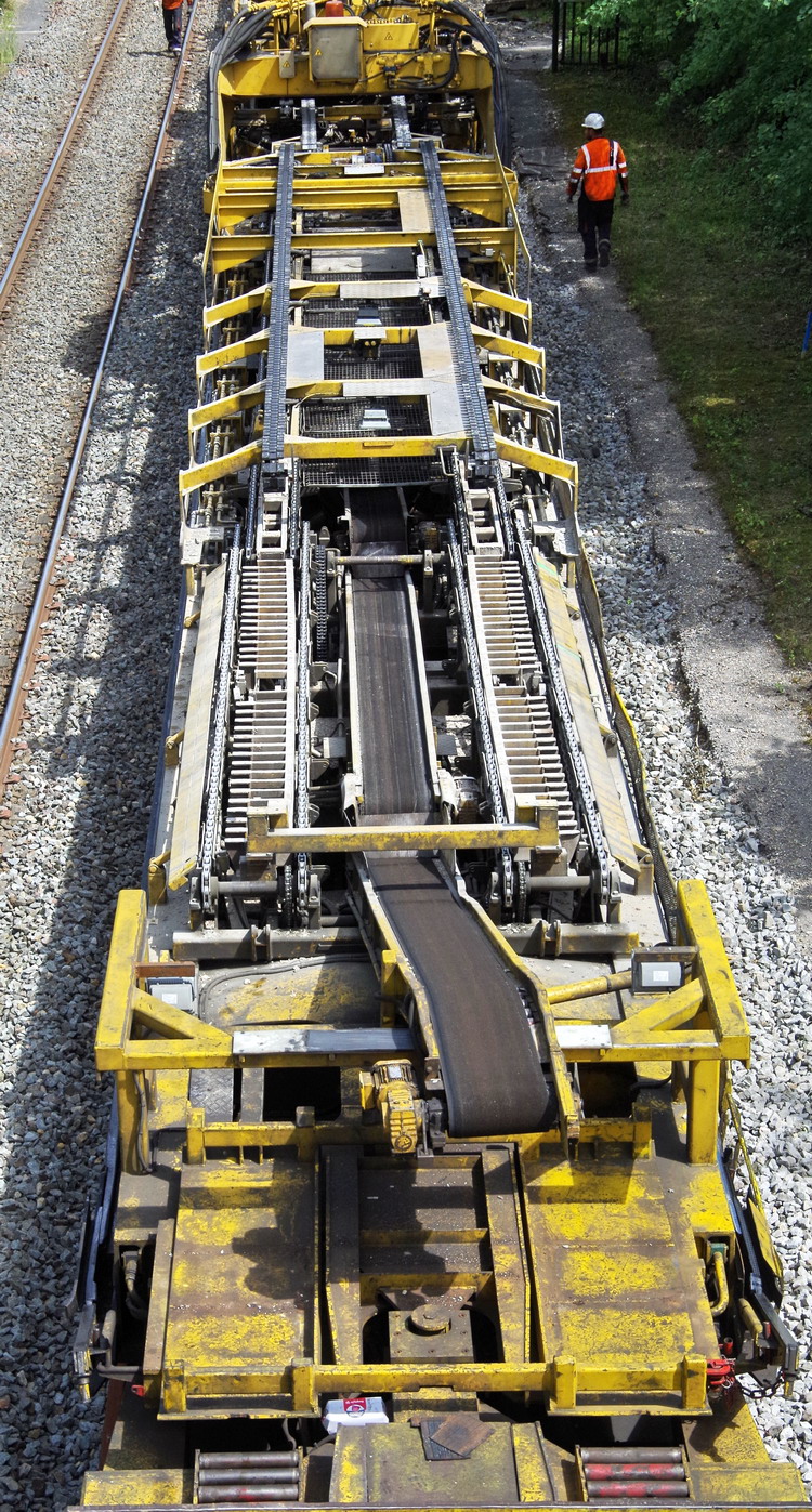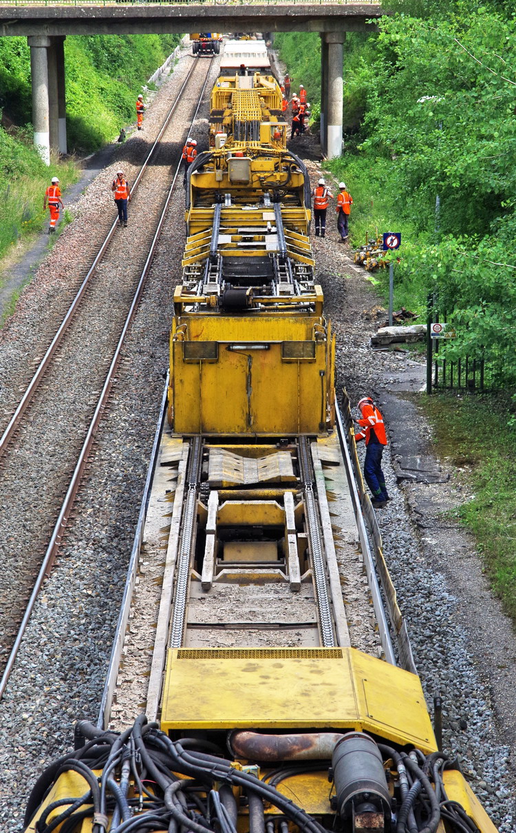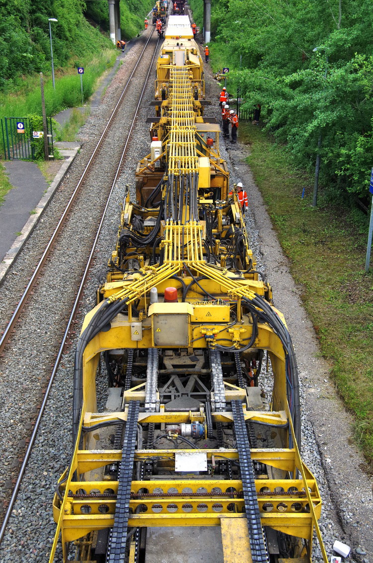 le wagon 5 WF - force avec poutre : évacuation du ballast, enlèvement des anciens rails et pose de nouveaux longs rails soudés