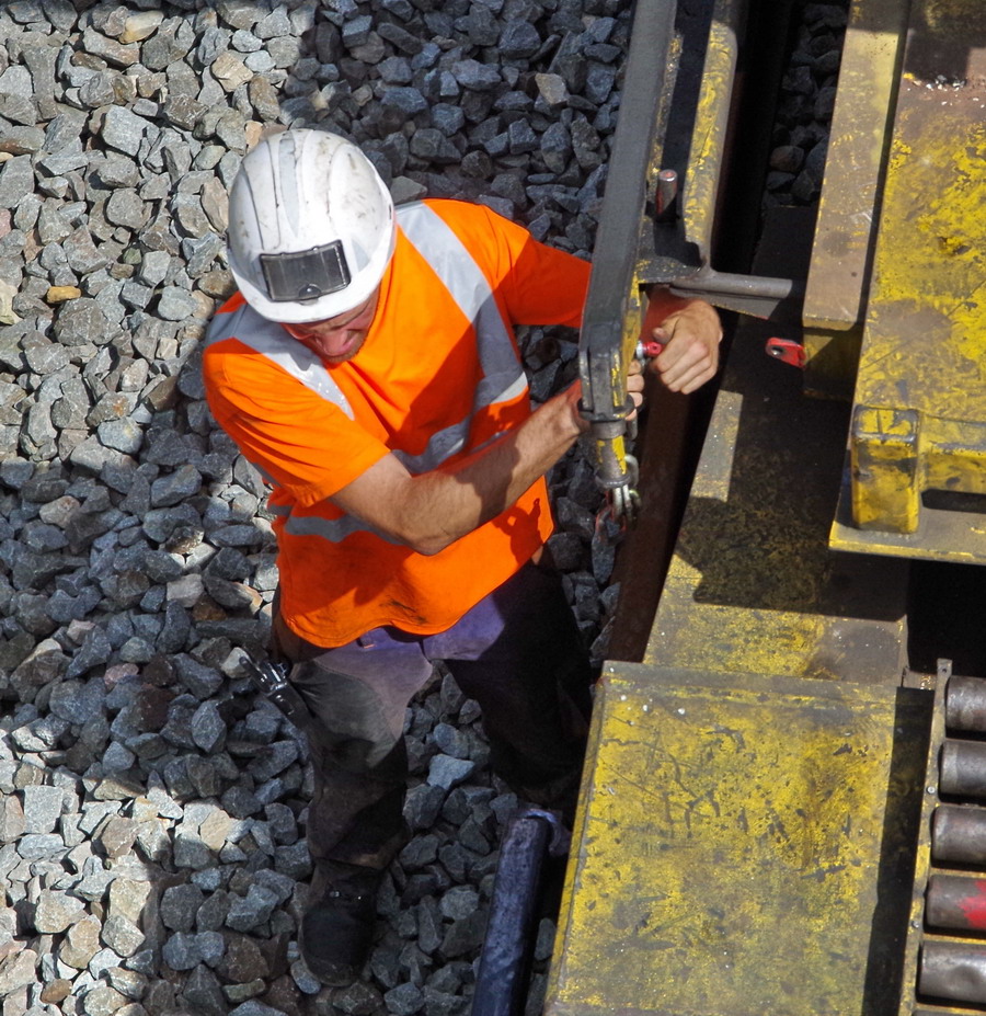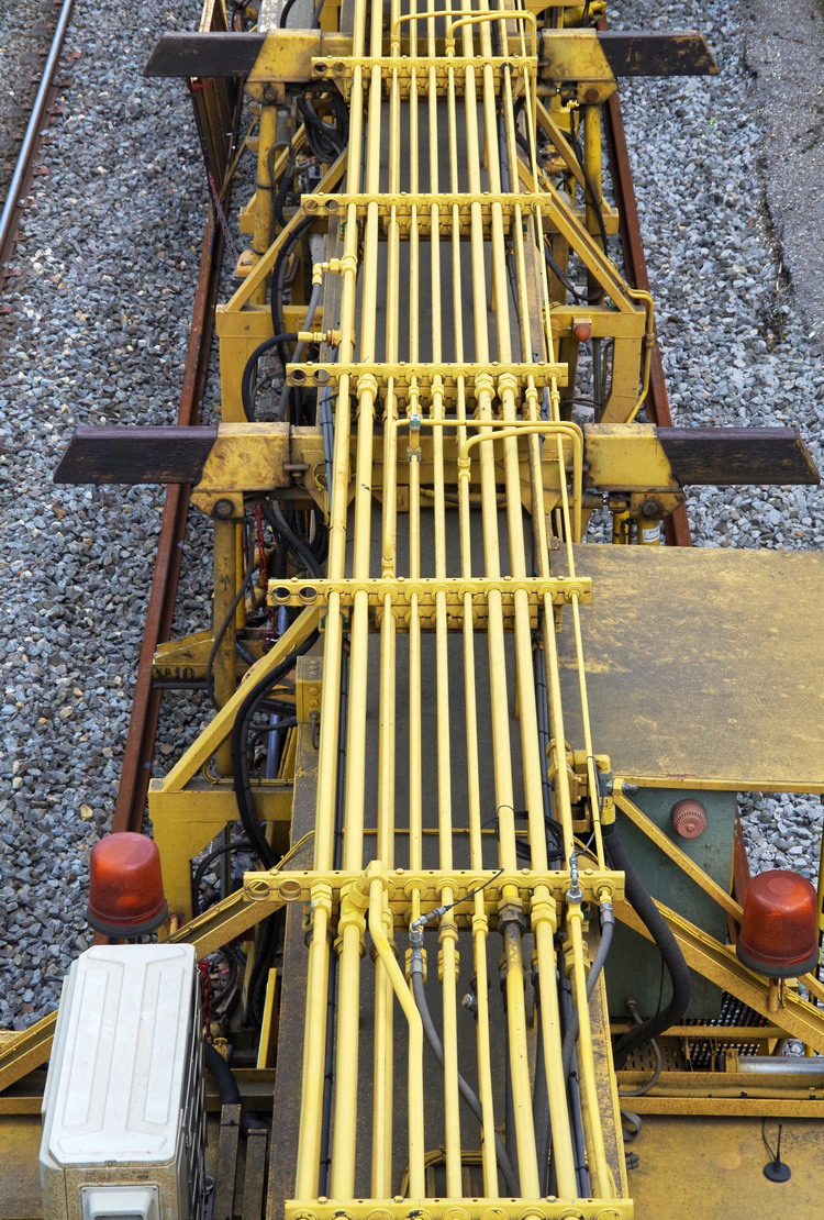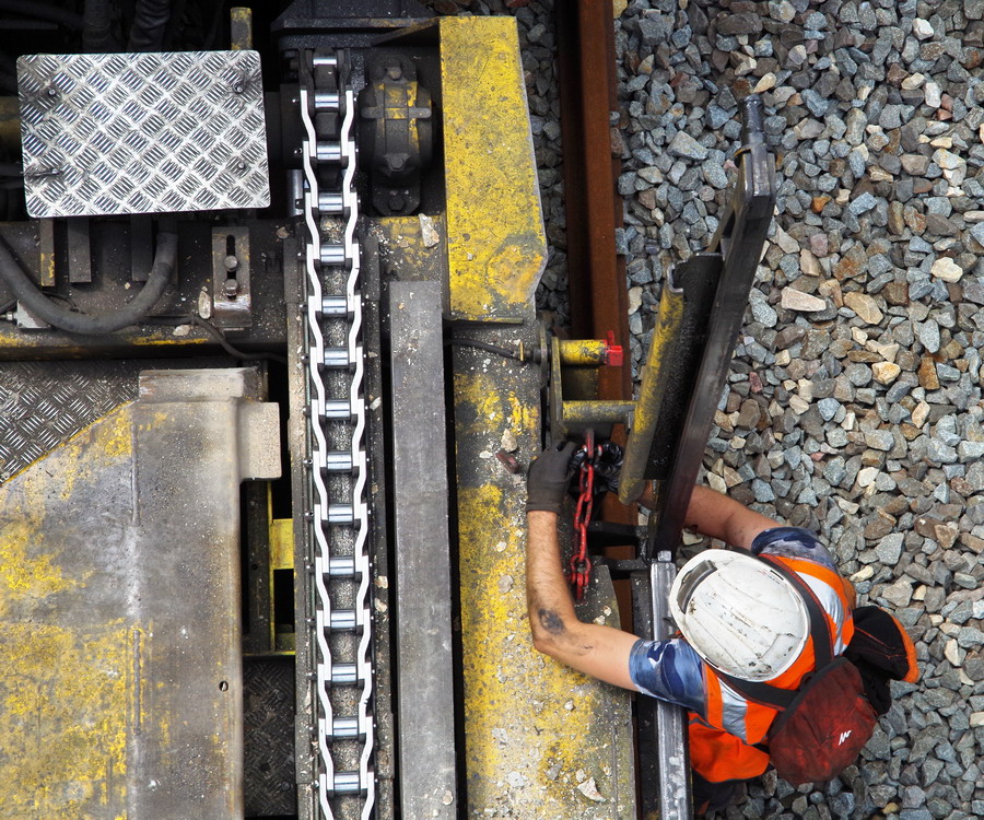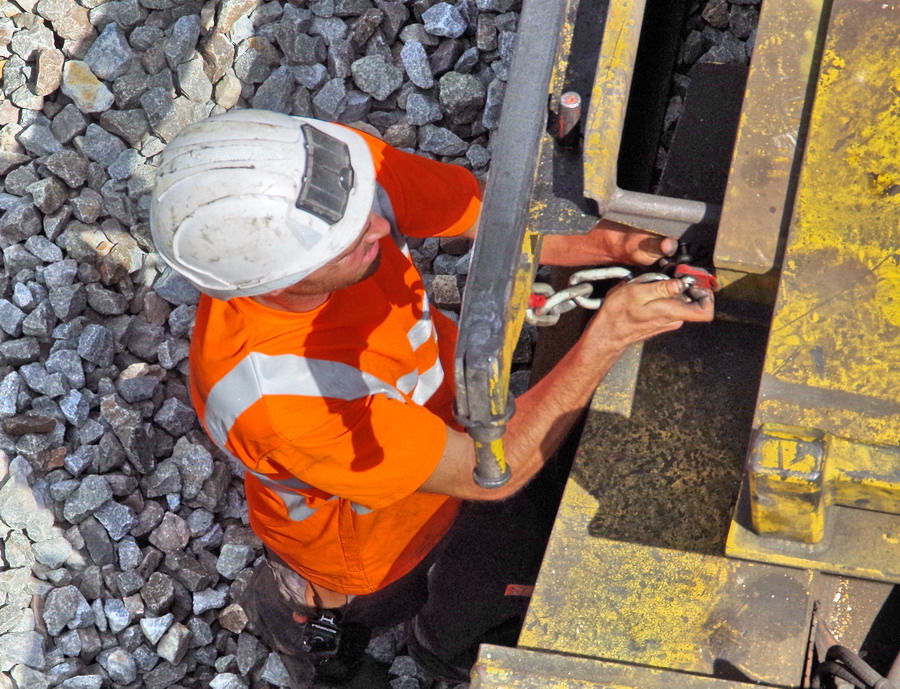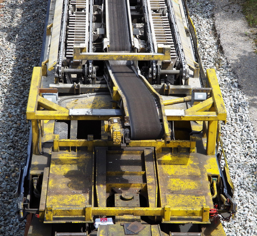 le wagon 4 WM - de manutention et groupe de travail avec chaîne de dégarnissage, dépose et pose de traverses