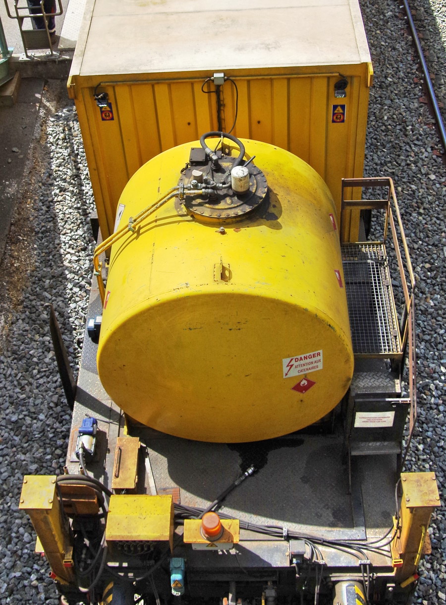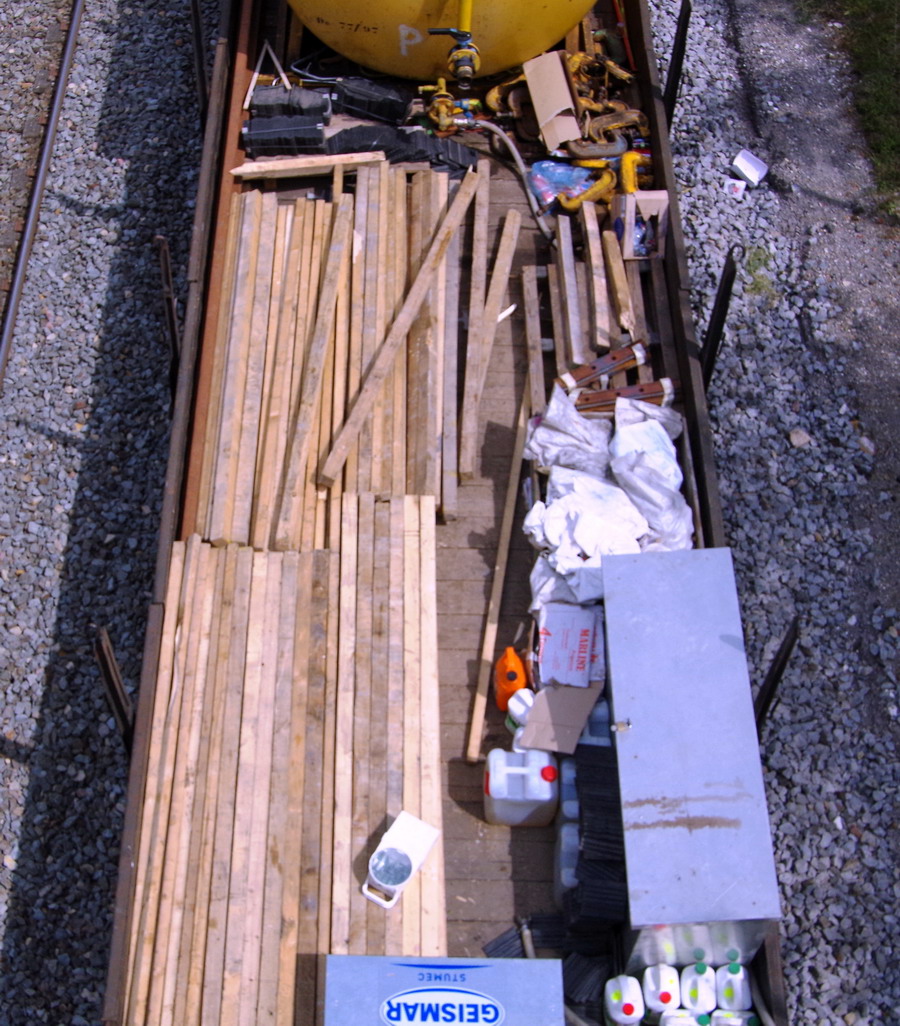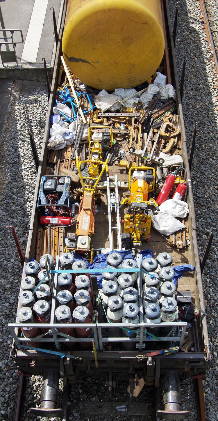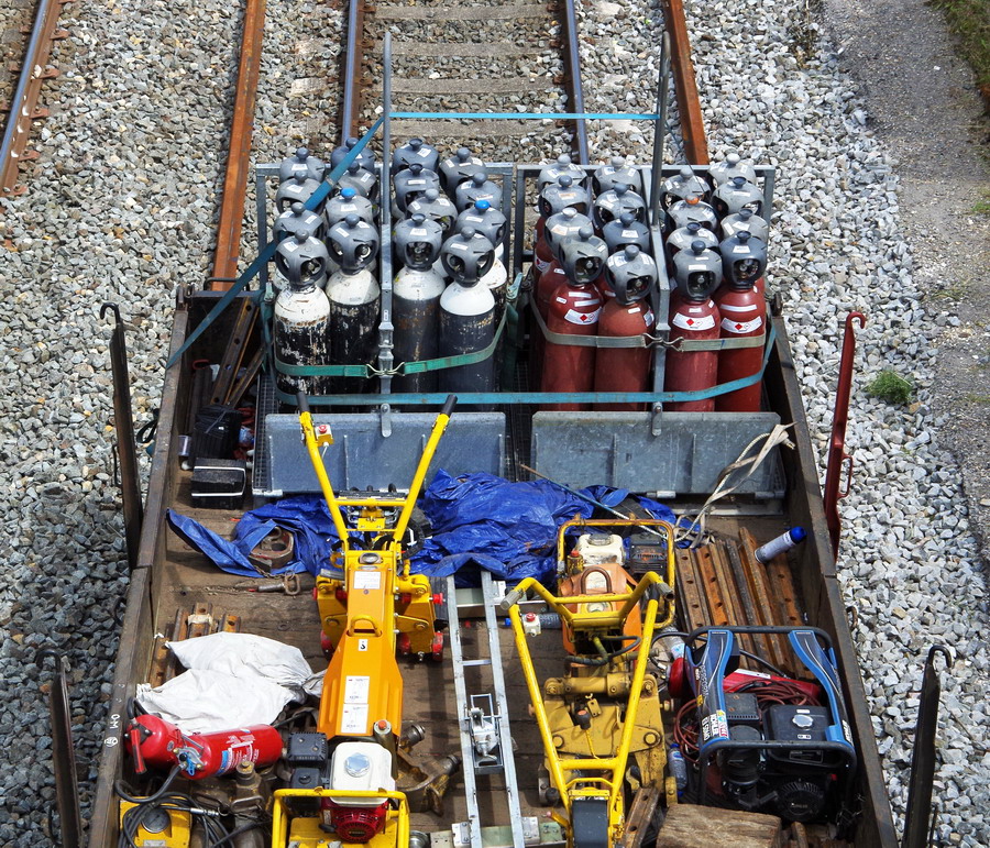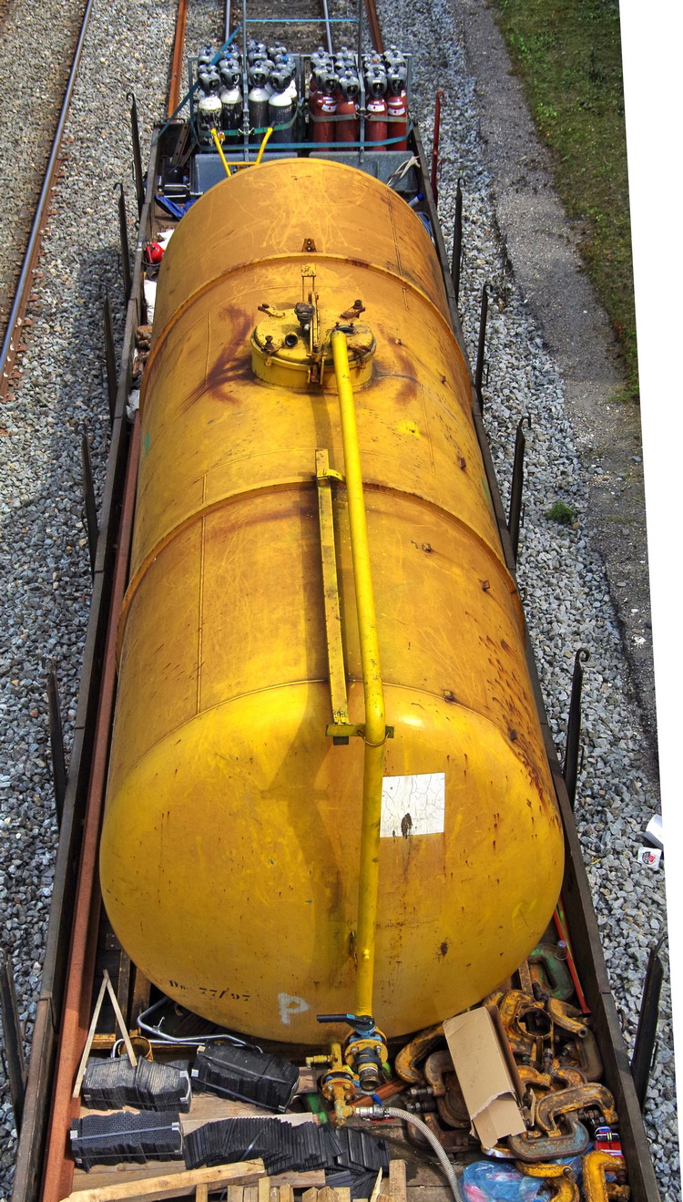 le wagon 99 87 9 383 878-5 R80 ETF avec les bouteilles d'oxygène et butane + citerne jaune)