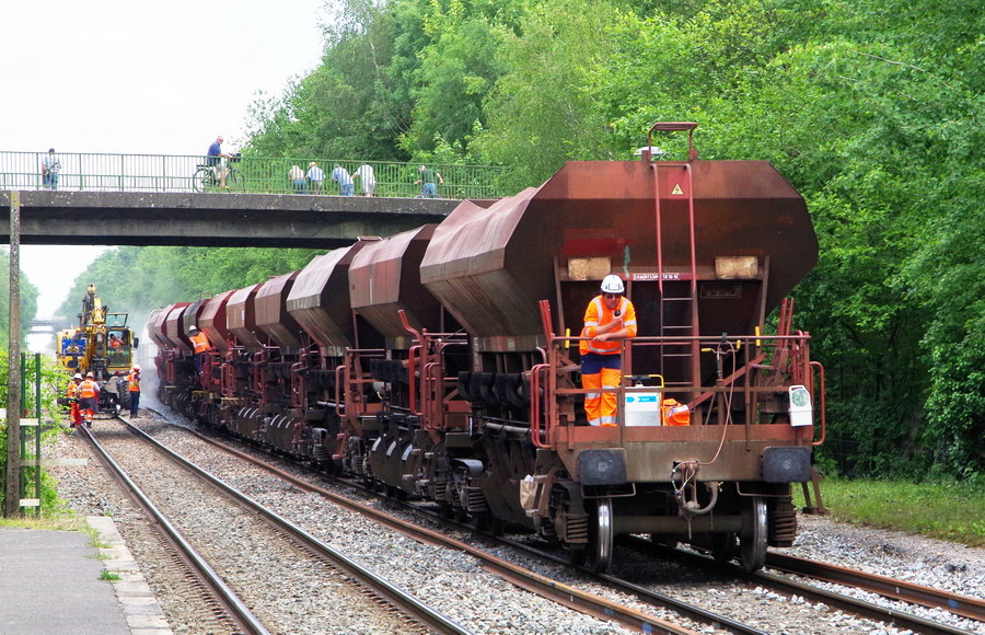 Train de pose P95 ETF 99 87 9 311 503-6 - ETF - "Addax avec le wagon 6 WFD - avec trémie à ballast, motorisation et cabine de conduite PK 20 à Marcelcave le 04-06-2018