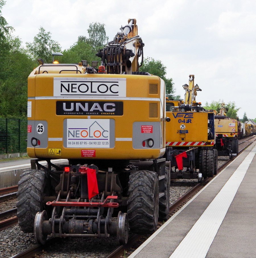 tour des trois Pelles Rail route UNAC 22 TRR Néoloc 1 + Vaiacar V704FR+ Meccoli 2 et Geismar KGT V Meccoli A en gare de Villers Bretonneux le 15-06-2018