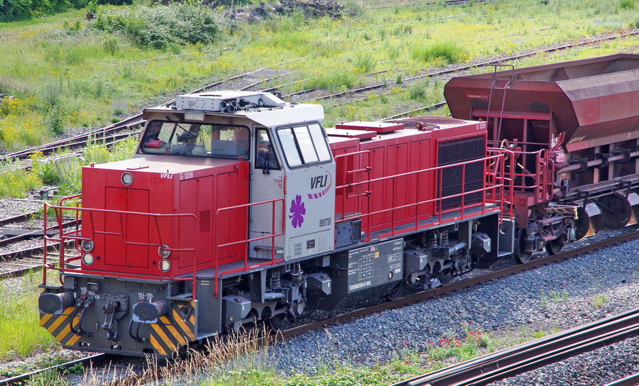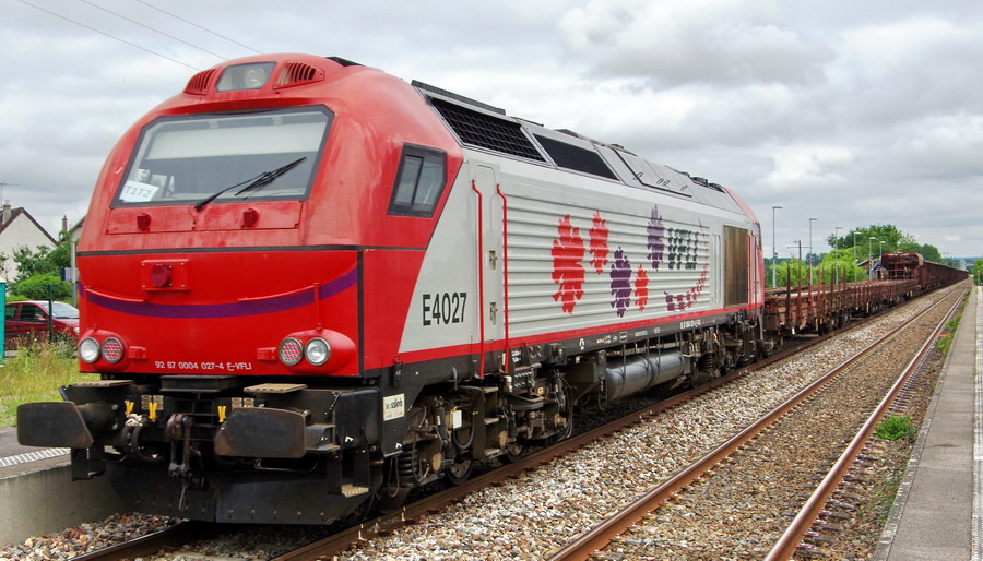 l'E4027 de VFL en queue du train n°T1T2 avec la E4022 en location en tête gare de Mennessis le 19-06-2018