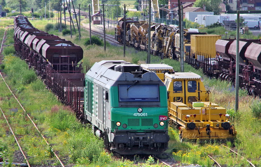 la BB 75061 sur le train n°K3K4 et une rame de Trémies D12 et la Bourreuse 08-32C Framafer n°2048 de 1982 - 99 87 9 422 518-0 Meccoli en gare de Chaulnes le 15-06-2018