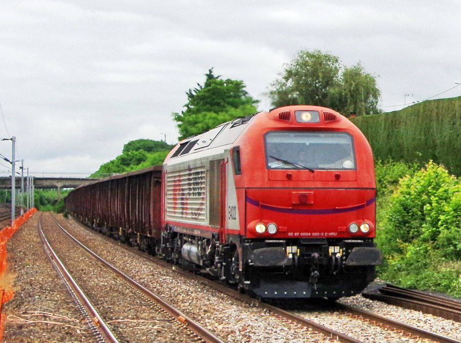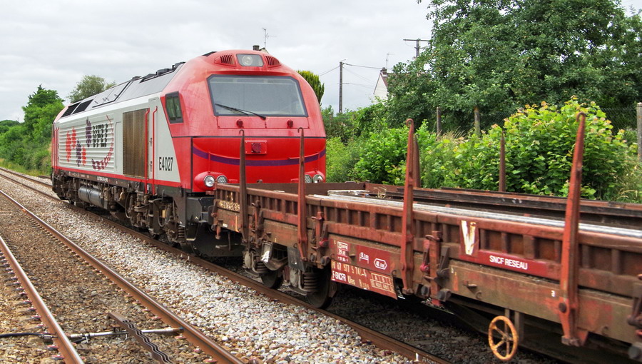 l'E4022 de VFLI en tête du train n°T1T2 avec la E 4027de VFLI en location gare de Mennessis le 19-06-2010