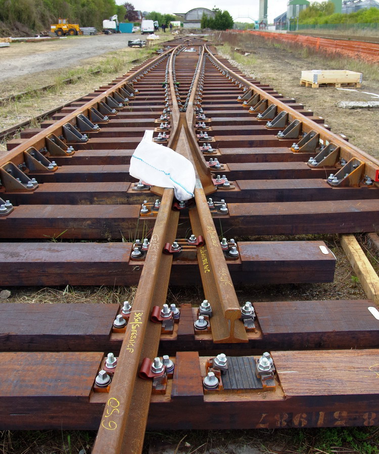- fixation par des tirefonds ou boulons avec des rondelles, des traverses en béton sur le rail avec système crapaud