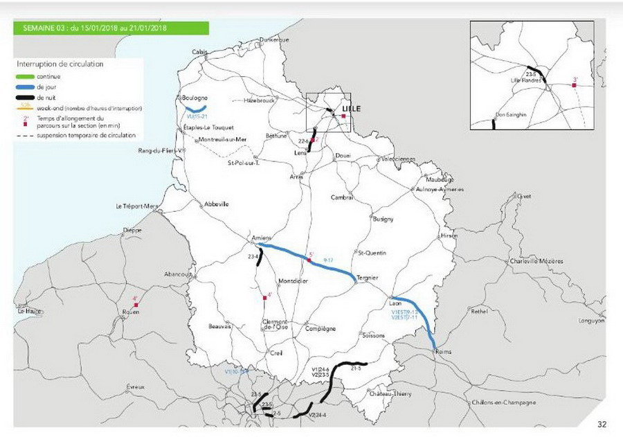 •Les tableaux et cartes des itinéraires à privilégier sur les principaux axes Fret : Paris-Lille, l’artère Nord-Est, Calais-Longueau et le passage de la frontière belge,