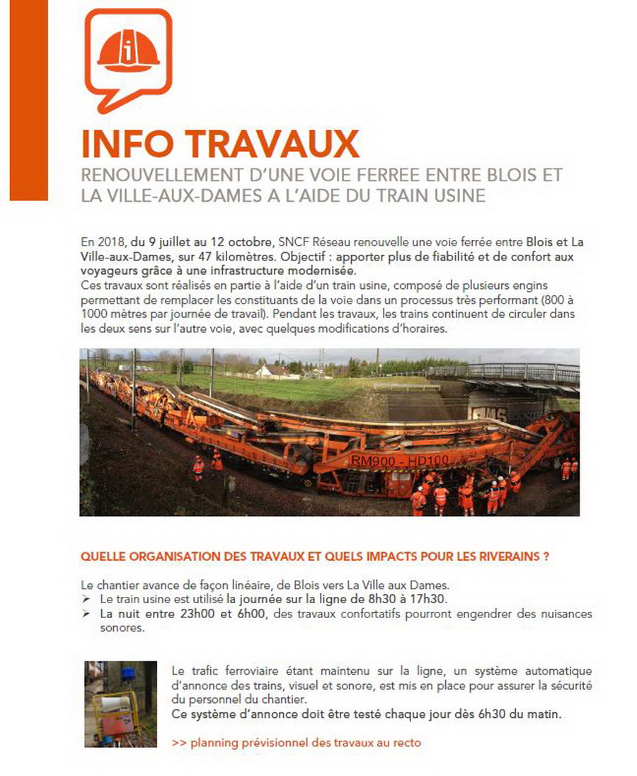 Voici un nouveau sujet sur le renouvellement complet sur la voie 1 entre Blois et La-Ville-aux-Dames entre le 9 juillet et le 31 octobre 2018