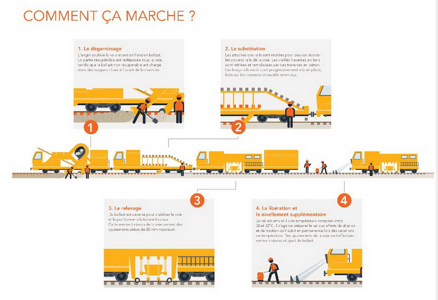 Ainsi, à l’été 2018, les constituants de la voie 1 seront remplacés sur la section Blois > La-Ville-aux-Dames soit sur 46 km. Les travaux seront réalisés à l’aide d’une ligne de production industrielle appartenant aux entreprises Meccoli et ETF. C’est une véritable usine roulante, composée de plusieurs engins permettant de remplacer les constituants de la voie dans un processus très performant (800 à 1000 mètres par journée de travail). Cette opération se décompose en 4 grandes étapes :