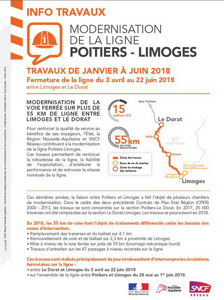 Le plus gros chantier de ces travaux de modernisation concerne le tronçon Limoges-Le Dorat. « La réalisation de travaux sur cet axe permettra un rétablissement des performances d'exploitation sur ce tronçon. Il y a actuellement des ralentissements importants au niveau de la vitesse pour des raisons de sécurité. Sur 10 kilomètres, on roule à 60 km\h au lieu de 80 km\h et sur 6 kilomètres, on circule à 80 km\h au lieu de 100 km\h. Ces 16 kilomètres de limitation font perdre trois minutes », explique Richard Depuichaffray, responsable du bassin de mobilité Nouvelle-Aquitaine.