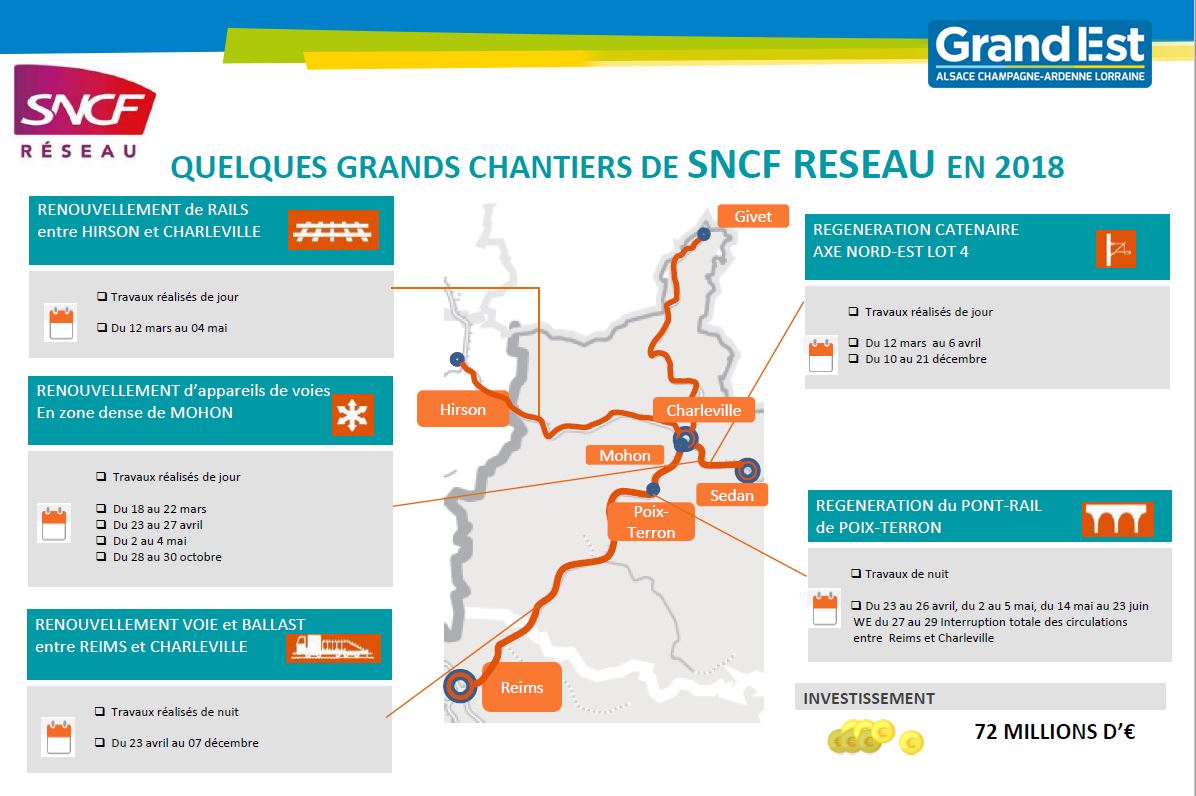 Afin d’améliorer le confort et préserver le niveau de sécurité, SNCF Réseau réalise des travaux de renouvellement de voie entre Reims et Charleville-Mézières. Ce chantier se déroule du 23 avril au 07 décembre 2018, sur 60 km de voie. Il consiste à remplacer la totalité des éléments qui constituent la voie : le ballast, les traverses, les rails et les systèmes de fixation des rails avec la technique appelée « Suite Rapide ». Concernant l’organisation du chantier, les travaux se déroulent de nuit dans des plages horaires de 9h