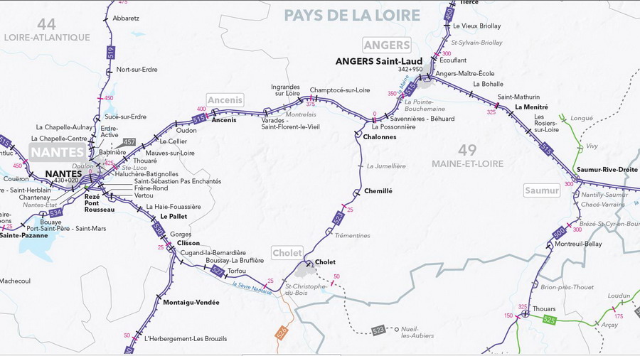 carte ferroviaire de Pays de Loire pour la ligne de Nantes à Cholet