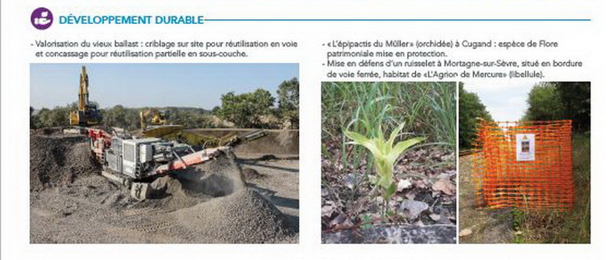 •Traitement des composants de la voie déposés : rails, traverses, ballas ◦valorisation du vieux ballast : criblage sur site pour réutilisation en voie et concassage pour réutilisation partielle en sous-couche ;