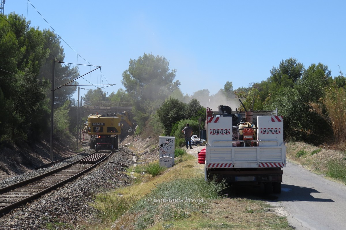 Effectivement, il y a en gare de Hyères une rame de trémies SGW, un chargeur Colas, le "village de conténeurs" ainsi qu'un tas de ballast neuf. Un peu plus loin en sortant de la gare on trouve un autre tas de ballast. Sur la ligne, j'ai rien vu du côté de Hyères.