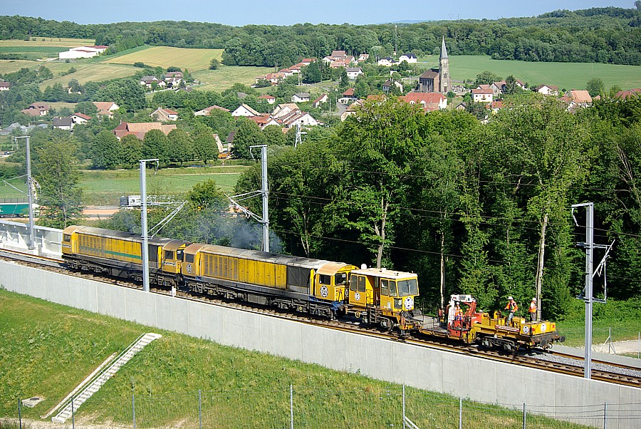 Départ de la gare TGV de Moval, à 20h15 environ, d'un train de chantier géant, à destination de la base de Villersexel, avec les engins de traction suivant :