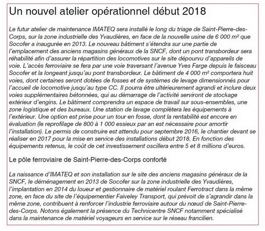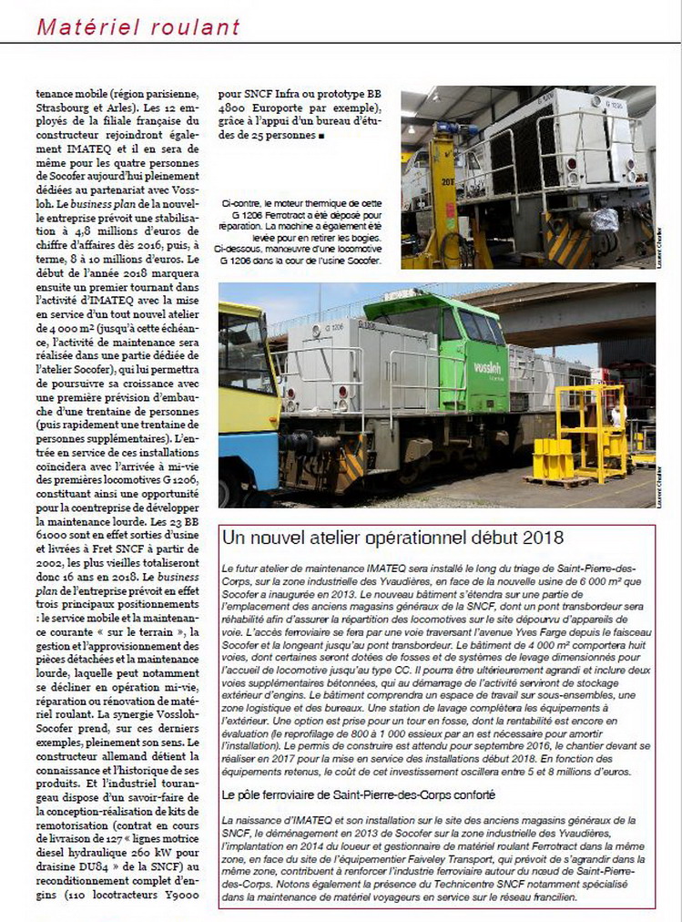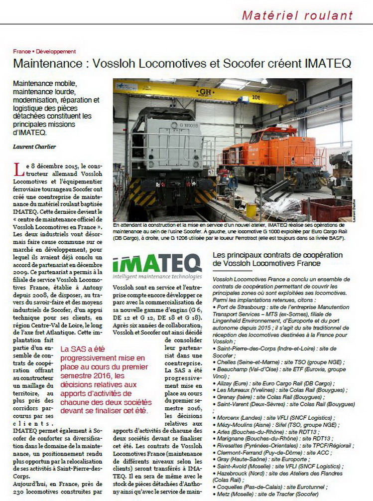 http://www.imateq.fr/Bienvenue chez IMATEQIntelligent Maintenance TechnologiesLa société IMATEQ est l’un des prestataires de maintenance de locomotives, leader sur le marché français. Cette co-entreprise de Vossloh Locomotives France et de Socofer a été créée en décembre 2015. Depuis cent ans Vossloh Locomotives construit des locomotives diesel sur le site de Kiel en Allemagne. Cette expérience a été mise à profit en France à partir de 2001 en proposant des prestations de service globales et en particulier dans le domaine de la traction diesel. Depuis cette date Vossloh Locomotives évolue avec succès en France, où elle dispose de ses propres centres d’intervention et de maintenance et depuis 2011 elle coopère avec Socofer, la principale entreprise française traditionnelle de matériels roulants ferroviaires. La société Socofer a été créée pour construire des matériels roulants dans les années soixante après reprise des établissements Billard, un constructeur de draisines ferroviaires depuis 1920. Depuis cette date Socofer s’est également spécialisée dans les prestations de maintenance.