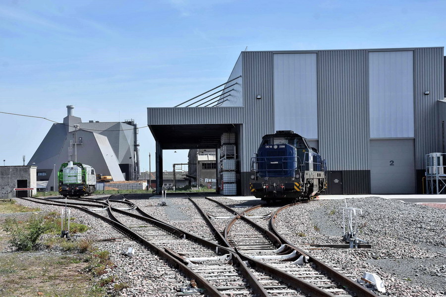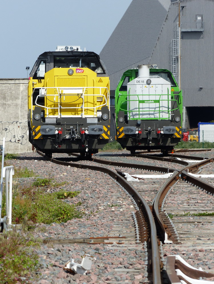 d'une nouvelle BB 79000 de SNCF RESEAU et d'une nouvelle DE 18 en livrée Vossloh en provenance de l'usine de Vossloh à Kiel en Allemagne