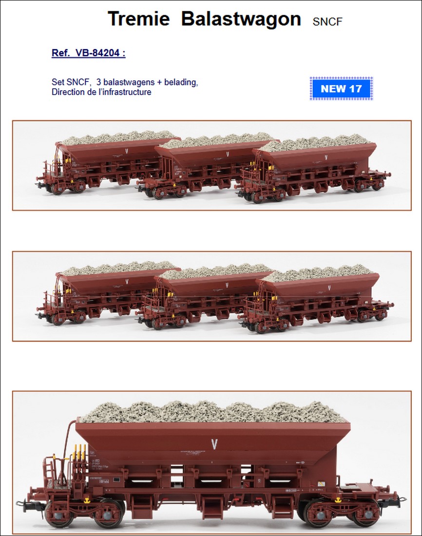 Je viens de voir chez "Pierre et Dominique" une promo pour un coffret de 3 trémies à bogies de chez "Van Biervliet" direction de l'infrastruture SNCF époque VI, série exclusive au prix de 155 euros,
