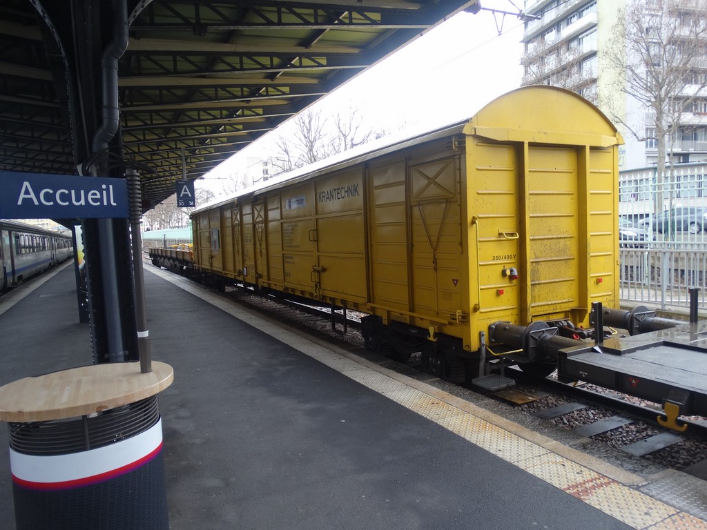 D-RTS 99 80 9320 011-6 - wagon porte agrès et poutre de levage en gare de Paris Est voie n°30 le 21 mars 2015