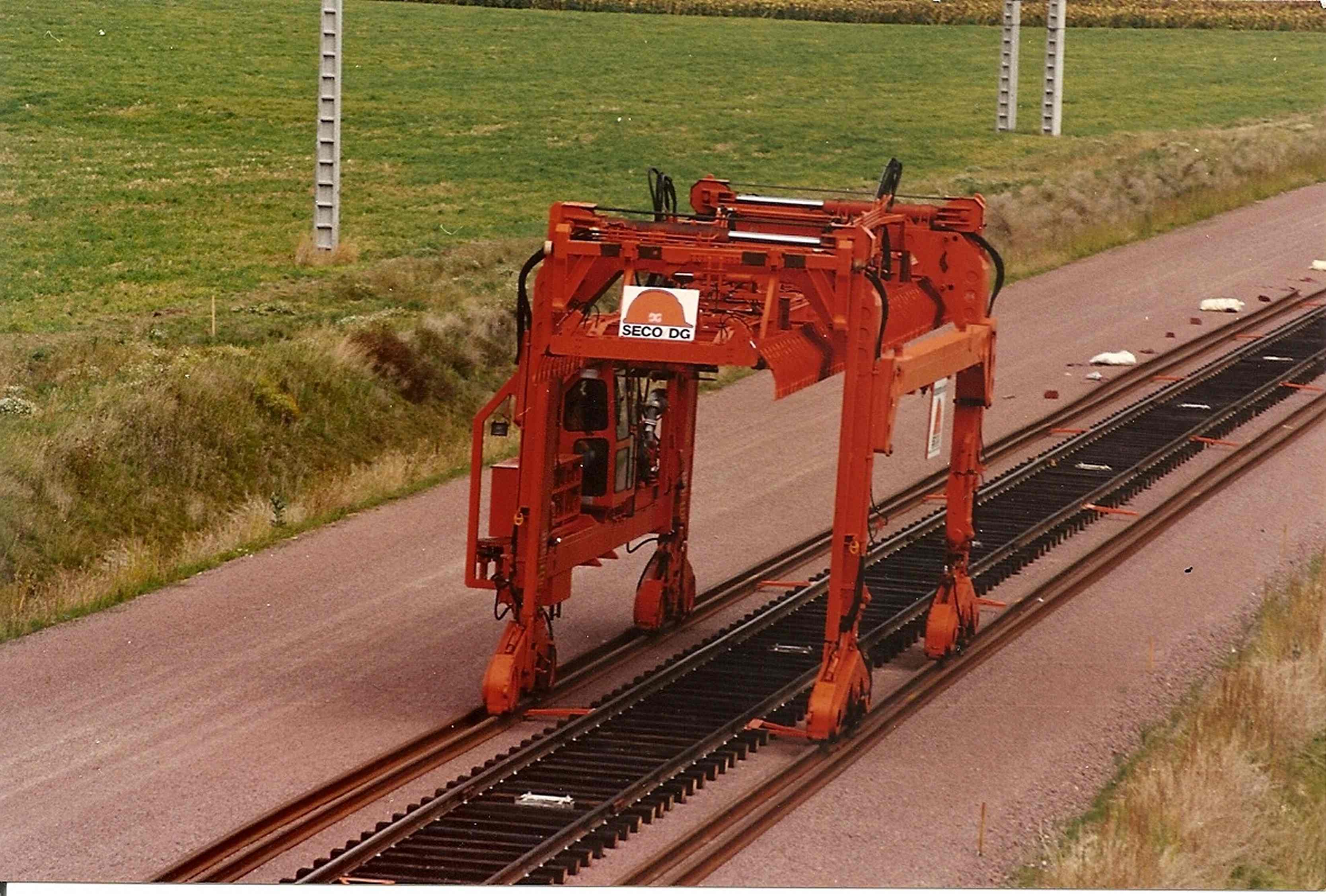 Voila une photo de l'un des deux portiques SECO/DG roulant sur les LRS pour la dépose des coupons de voie provisoire et la pose des traverses béton définitives.