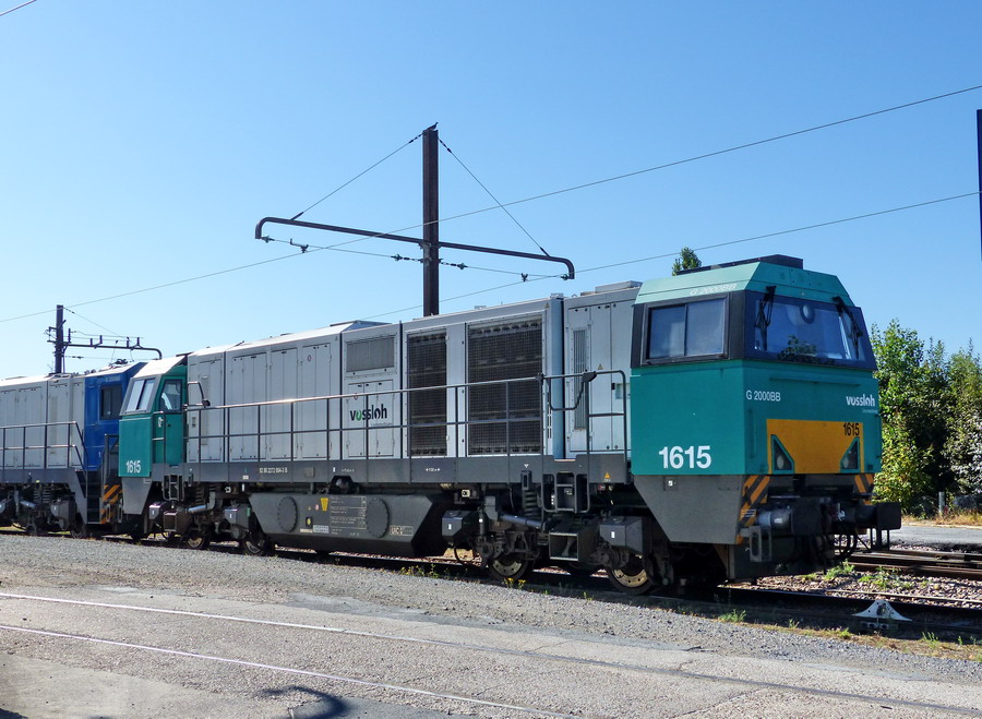Vossloh G 2000-3 BB de la SNCF Fret Benelux Dans la société allemande Vossloh Locomotives GmbH (anciennement MaK), à Kiel, cette locomotive diesel-hydraulique type G 2000 BB passe pour être la machine la plus puissante de sa catégorie. Elle fut présentée pour la première fois dans sa version d’origine en septembre 2000 à Innotrans, à Berlin. L’étroite superstructure avec les passerelles de circulation latérales et les postes de conduite terminaux asymétriques sautèrent alors immédiatement aux yeux. Vu respectivement dans le sens de marche, le poste de conduite avant s’étendait à gauche sur toute la largeur du véhicule alors qu’à droite, il formait une surface plane avec l’étroite superstructure. A côté de chaque poste de manoeuvre se trouvait une marche de manoeuvre qui se prêtait aussi parfaitement à une exploitation avec radiotélécommande. Ainsi, les manœuvres nécessaires en fin de parcours pouvaient être réalisées sans problème sans avoir recours à une seconde locomotive. La G 2000 BB se caractérise par son principe abouti de construction modulaire, le choix de composants de grande qualité, sa grande fiabilité et sa disponibilité. Outre la version originale, deux variantes de la G 2000 BB furent construites entre 2003 et 2010 avec une cabine de conduite faisant toute la largeur de la loco. On disposait ainsi d’un poste de conduite bien plus spacieux, offrant deux places assises avec une vue équivalente sur la ligne. Les premières unités de G 2000-2 BB (table de conduite placée à gauche) furent vendues à différentes entreprises de transport privées en Italie, la variante G 2000-3 BB (table de conduite placée à droite) fut quant à elle distribuée en France, Belgique, aux Pays-Bas et en Allemagne. Lors de son introduction sur le marché, la G 2000 posa de nouveaux jalons pour les locomotives diesel de ligne en termes de design, de fonctionnalité et de Life Cycle Costs (LCC). Avec une puissance pouvant atteindre 2700 kW, une vitesse maximale de 120 km/h, un réservoir de 5000 litres et un poids en service de 87 à 90 tonnes, elle peut être utilisée presque partout. Même l’un des secteurs du trafic marchandises de la SNCF – Fret Benelux – avait loué en avril 2007 deux G 2000-3 BB fraîchement sorties de l’usine à la firme de leasing ACT (Angel Trains Cargo) avec les numéros 1615 et 1616. Elles circulaient dans le service marchandises entre les Pays-Bas, la Belgique et la France. Le contrat de location s’acheva en 2011. Les nouveaux loueurs furent d’abord l’EPF (Europorte France) et, à partir de 2015/16, la GTF SAS à Barbizon.