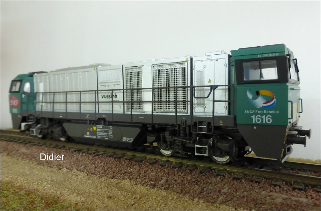 Modèle réel: Locomotive diesel lourde Vossloh G 2000 BB avec cabine de conduite symétrique. Locomotive de la SNCF, affectée au trafic marchandises Fret Benelux. Livrée gris clair/verte avec filets gris terre d'ombre. Numéro d'immatriculation loco 1616. État de service vers 2010.