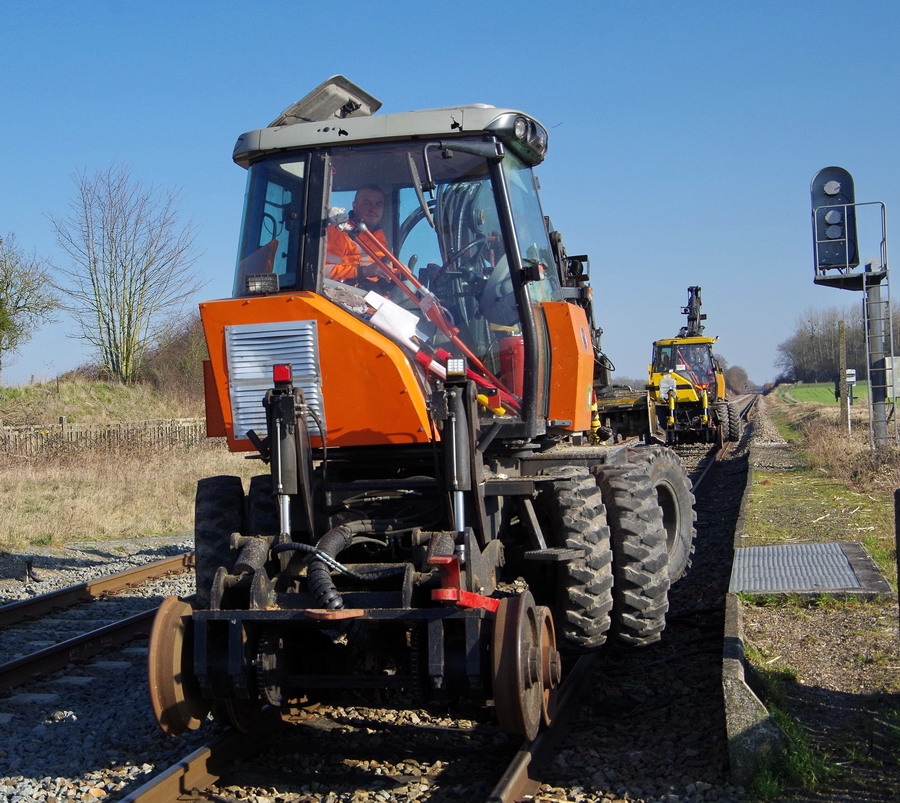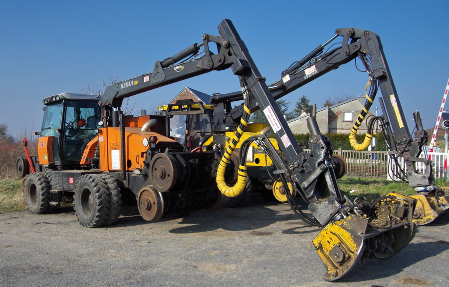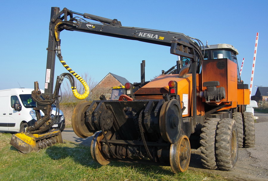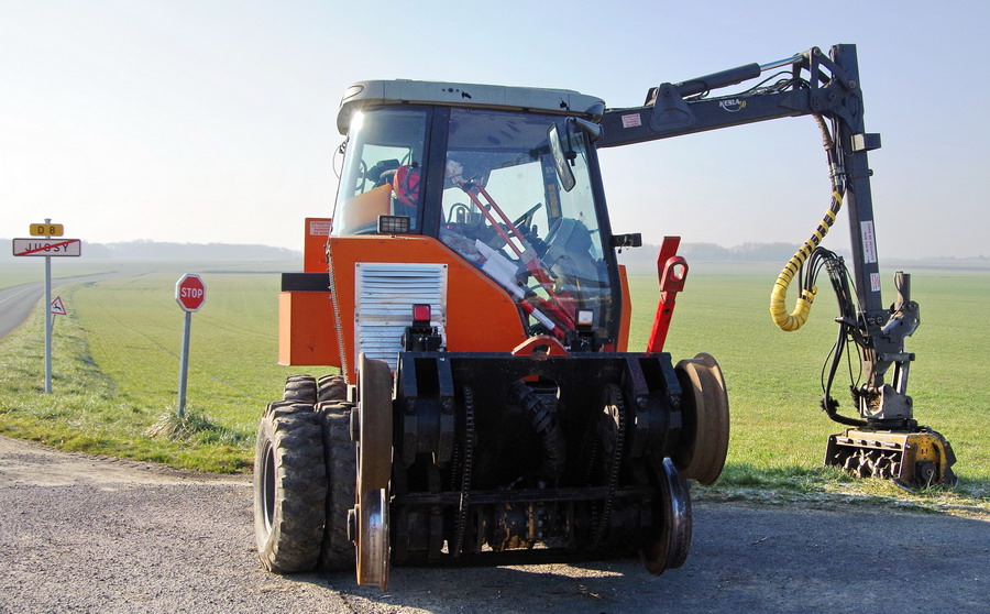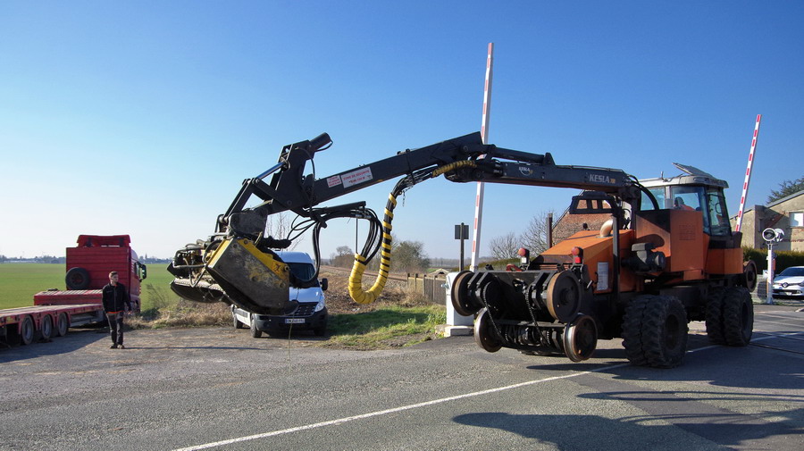 la débroussailleuse rail-route va se mettre sur les rails elle profite du passage a niveau pour se mettre sur les rail puis elle part