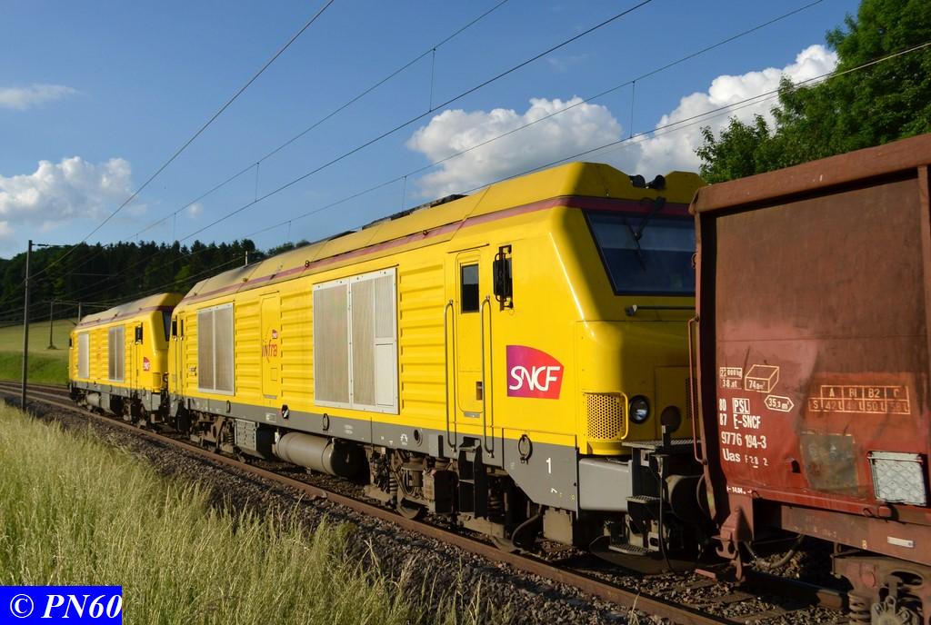 Bonjour Voici la machine (mise en service le 28-01-2009) avec une rame de wagons plats R39 et de la rame LRS ensemble n°23 sur la zone de garage des rames infra à Saint Pierre des Corps le jeudi 20-11-2014, train vide pour Moulin-Neuf