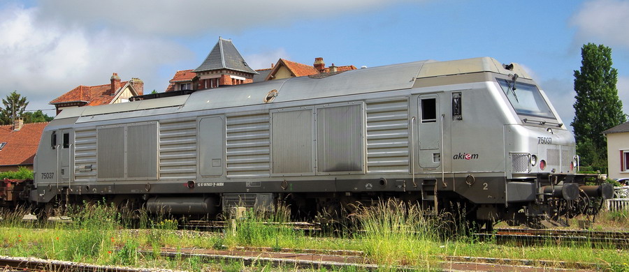 La BB 75037 mise en service le 27-07-2007 pour Fret SNCF en livrée verte puis propriétaire d'AKIEM en livrée grise