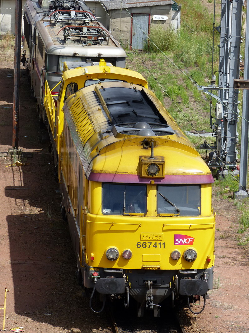 Voici la 667411 sur une voie de garage des machines HS avec les 664639 en livrée Infra la 9247 équipée d'archet acier utilisée comme wagon racleur et la 22304, sortie Nord du dépôt de Saint Pierre des Corps le dimanche 03-08-2014
