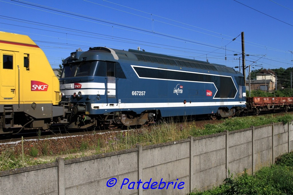 Voici la BB 667257 en acheminement dans un train de l'Infra, à Drancy.