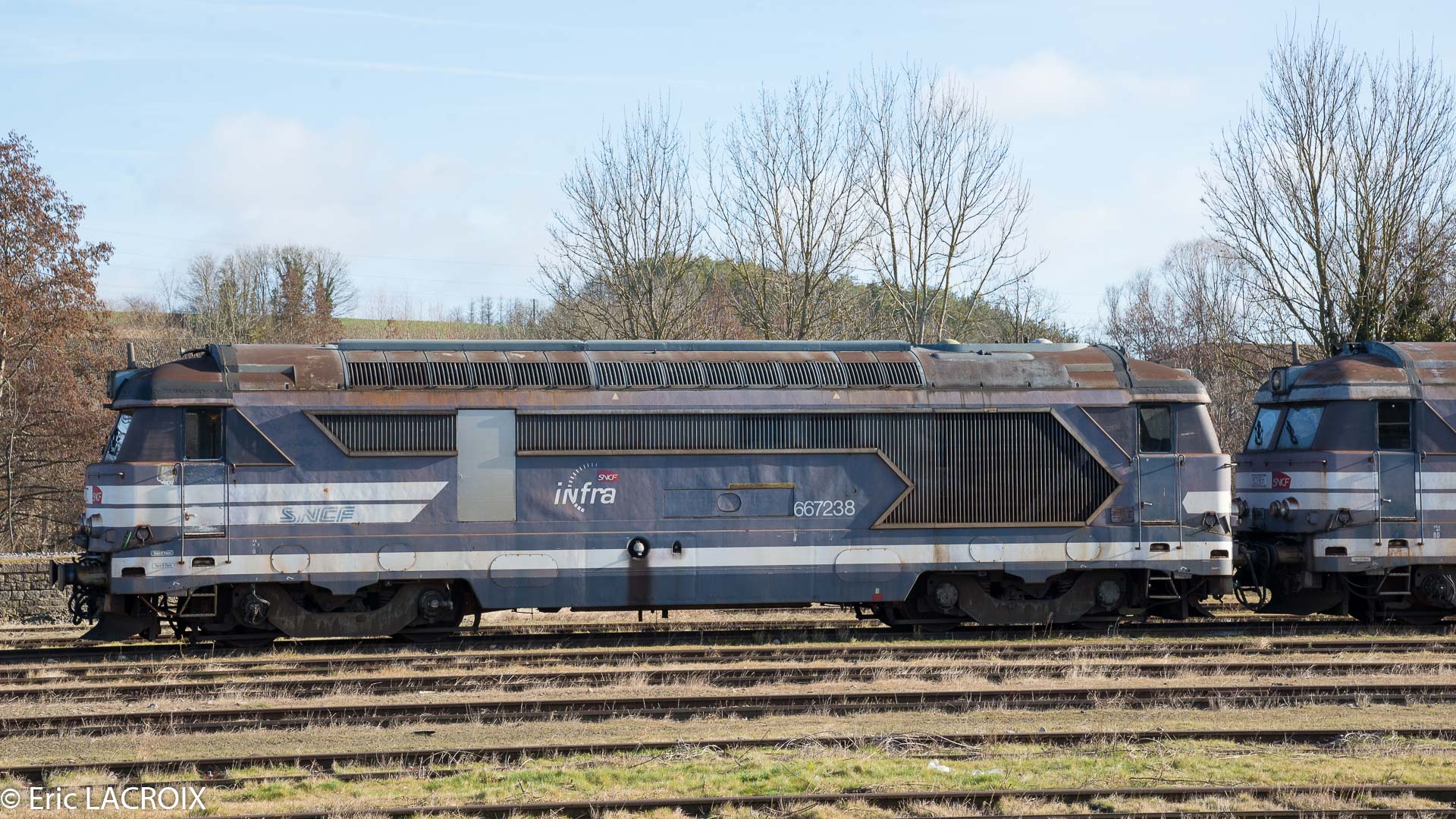 Voici la 667238 Infra (ex 67057 mise en service le 20-05-1965) en queue de TM à la sortie Nord du dépôt de SPDC le 11-11-2014