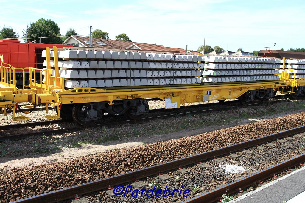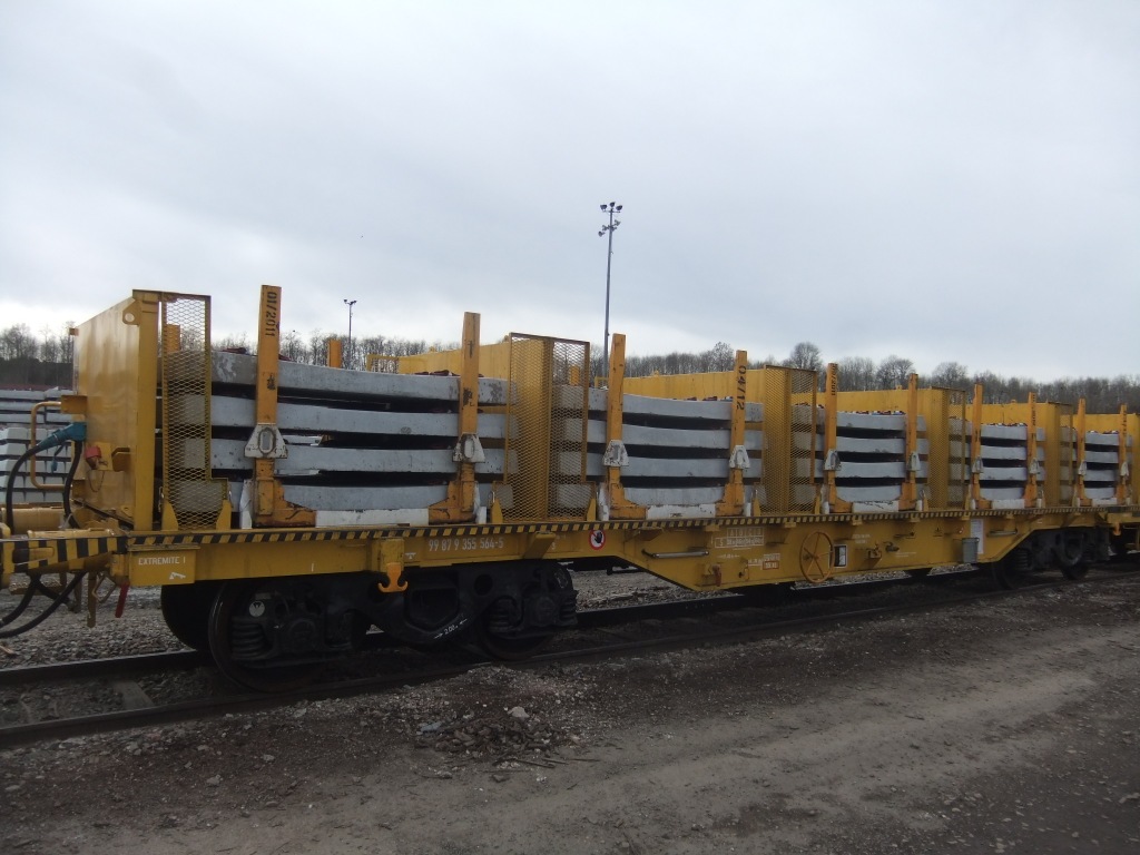 En Allemagne, c'est différent: Les traverses sont chargées directement sur les WTT, sans palettes. Cette fois en travers, ce qui permet de les faire disposer directement par le portique sur le tapis du WM. perso, je connais les wagons Slps de l'entreprise Leonhard Weiss qui sont, en fait, des wagons plats de construction assez simple sur bogies Y 25 soudés, équipés de rails de guidage. http://www.goederenwagens.nl/gallery3/i ... 110813_046
