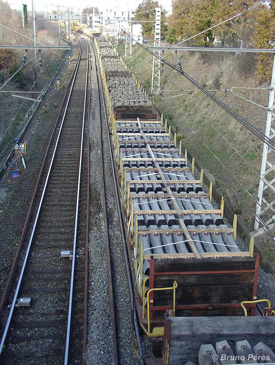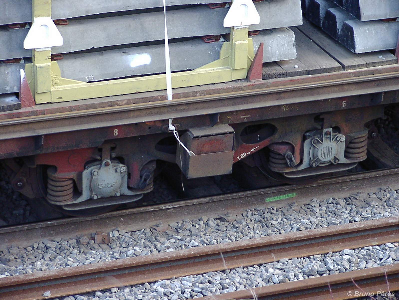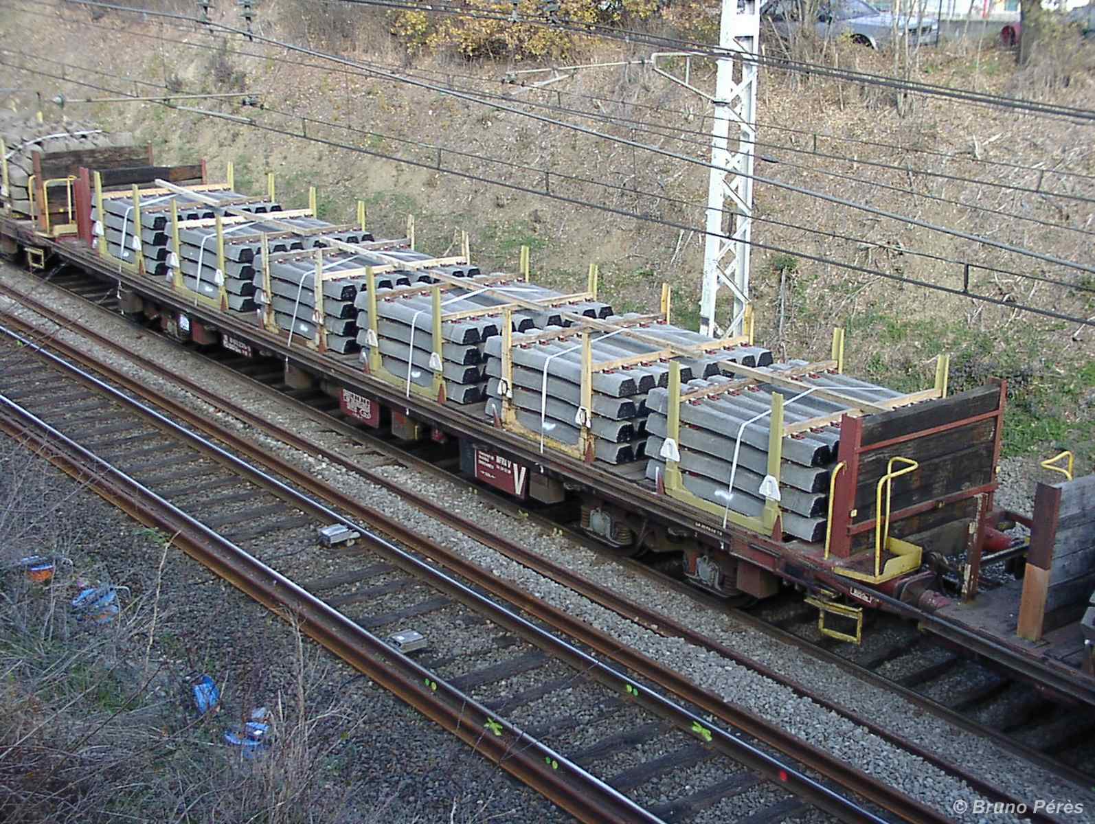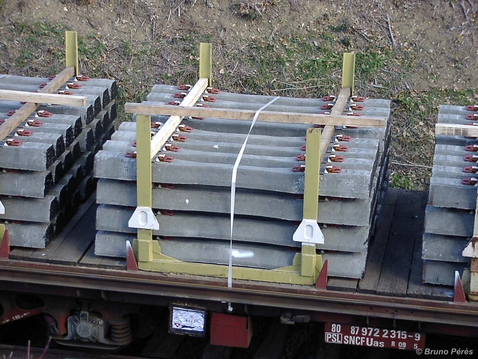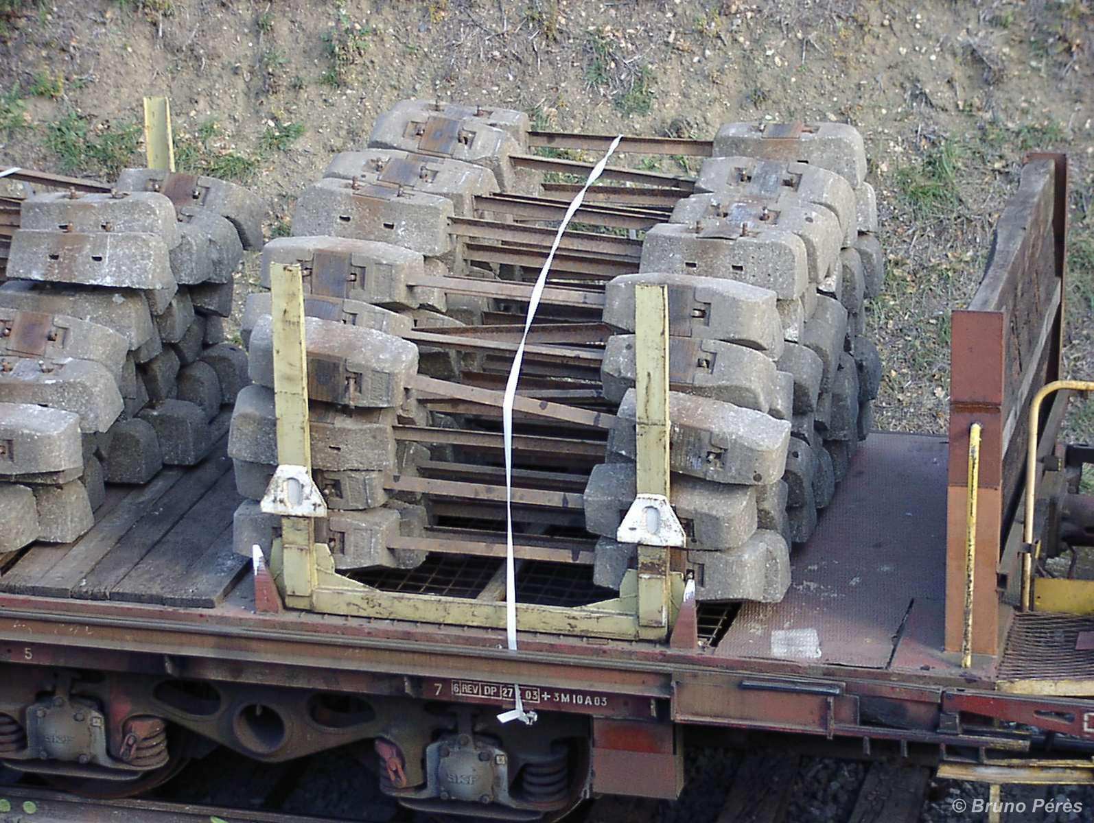 Voici quelques photos de plats chargés de traverses palettisées pour suites rapides. Ces palettes sont prises en charges sur chantier par des portiques circulant sur des rails fixés sur chaque flanc des wagons. Ces portiques alimentent le train de substitution SMD 80 (ETF ou Colas Rail), la TSV 21 GP (TSO et Colas Rail) ou le futur P95 d'ETF.