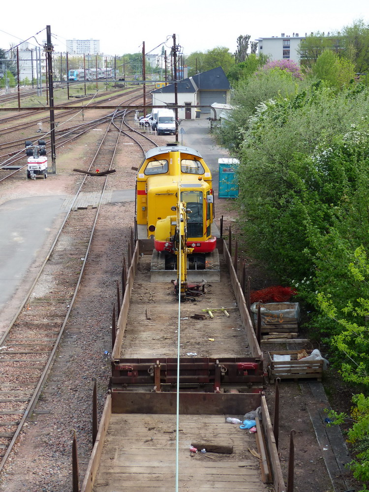 Voici le 80 87 978 2 578-9 Uas S39 2 SNCF-PSL sur un train de travaux de Meccoli avec une petite pelleteuse Airman AX 50