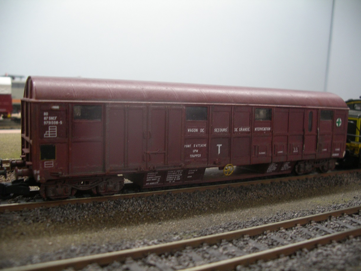 le wagon de secours de grande intervention, transformation du wagon bétailler Jouef, et la voiture de cantonnement
