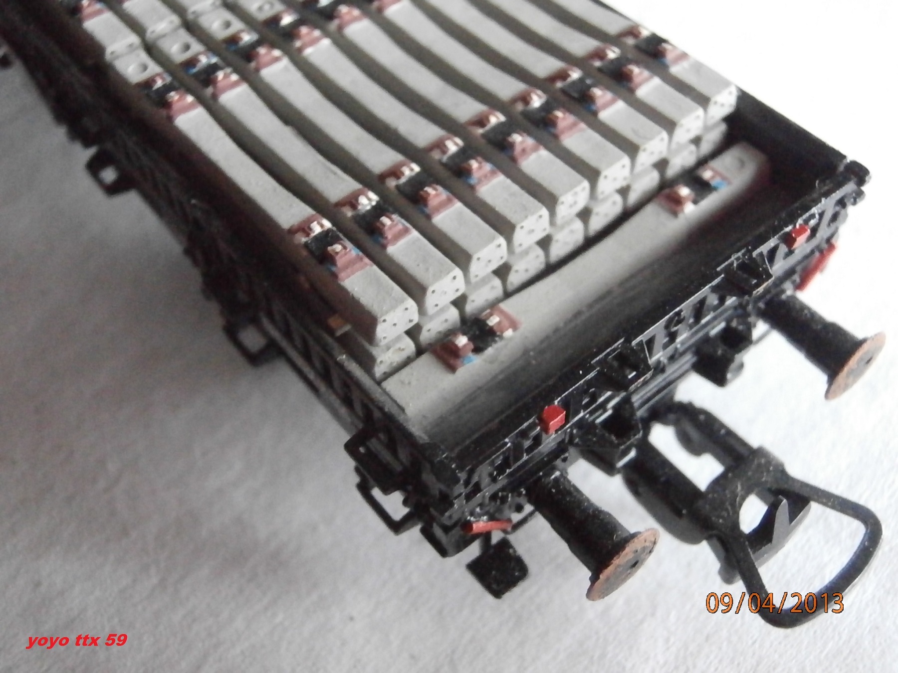Voici l'une de mes réalisations purement imaginaire , sauf pour le chargement qui lui est bien réel(d'aprés photos).La base du wagon est d'origine Sai(Kibri).Les traverses proviennent de la voie traverses beton code 83 de chez Roco "ref:42401".