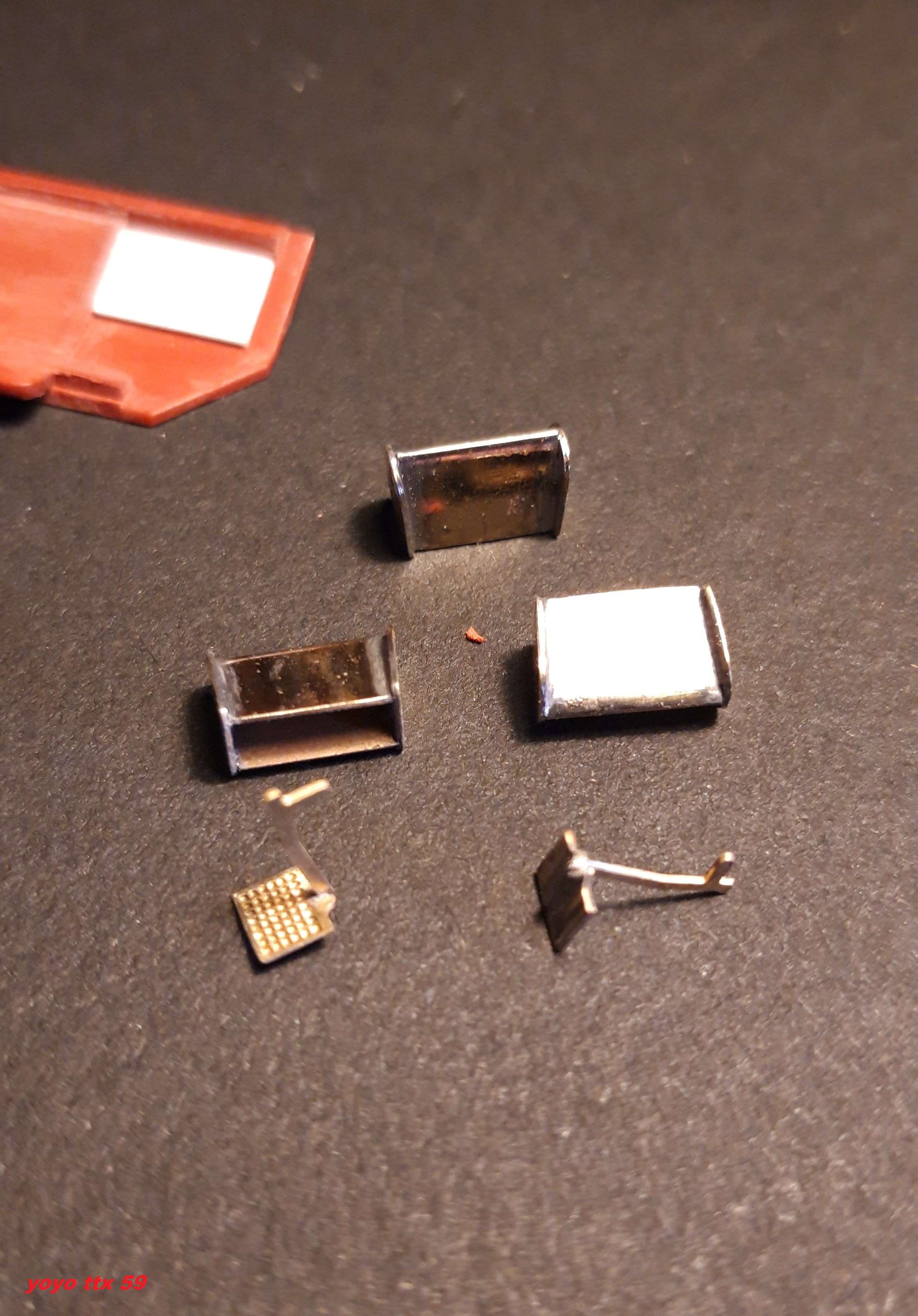 Je fais des patines et je voudrais faire des trémies à essieux Uas sur la base de wagon roco V. J'ai bien vu que le modèle roco n'est pas tout à fait conforme (2 échelles, rambardes fausses, ...) mais surtout il est rempli de ballast à ras bord.