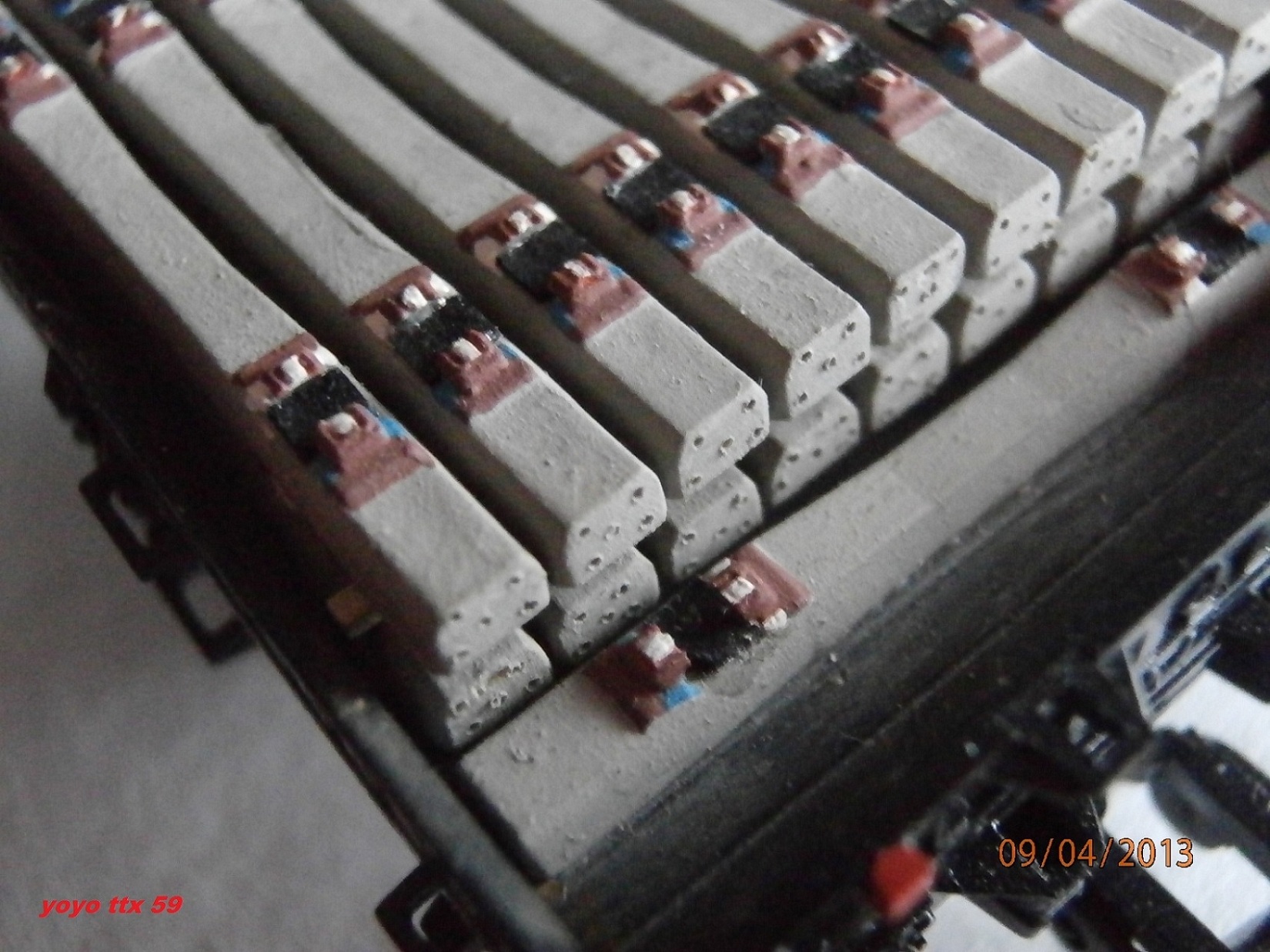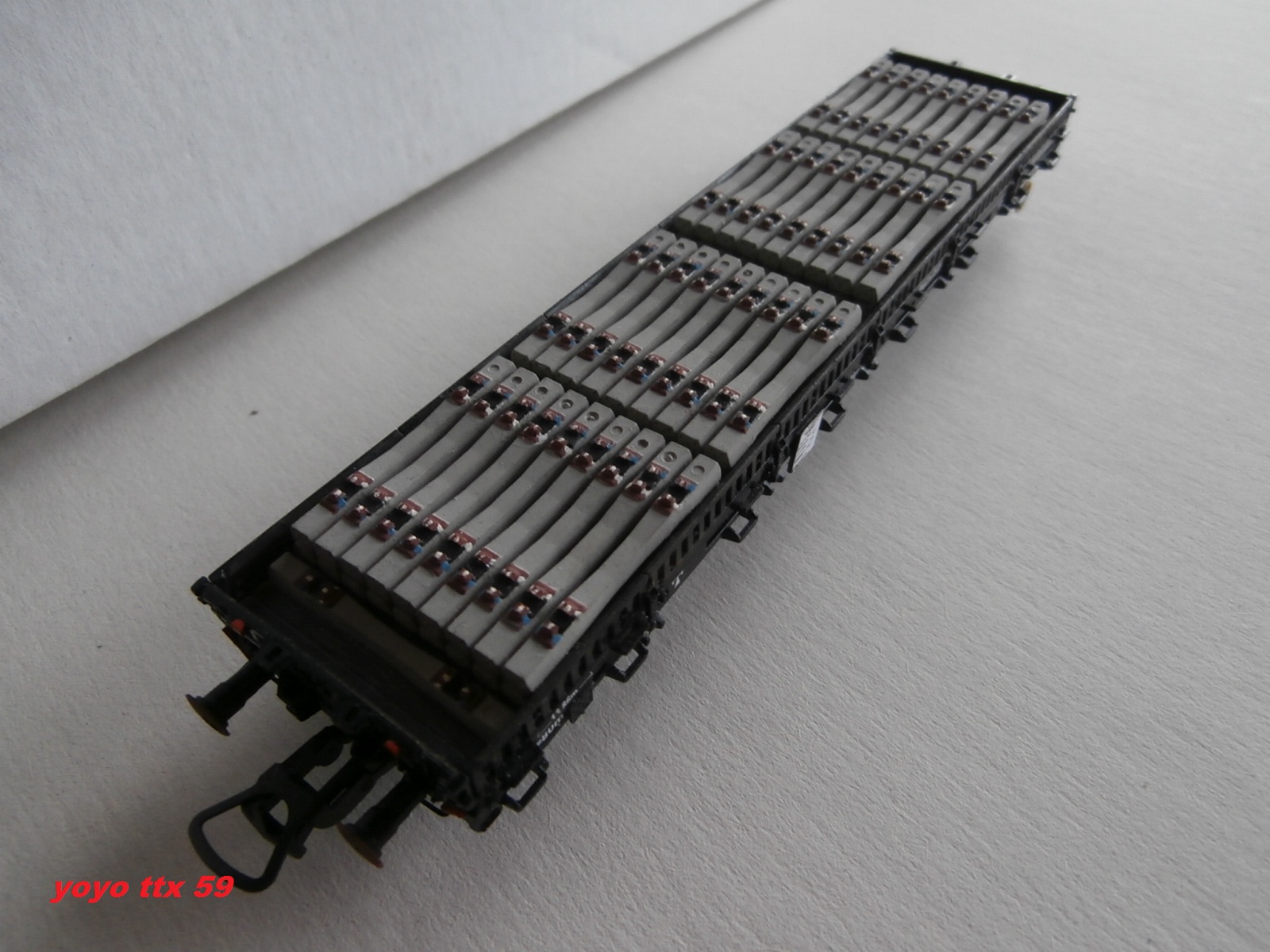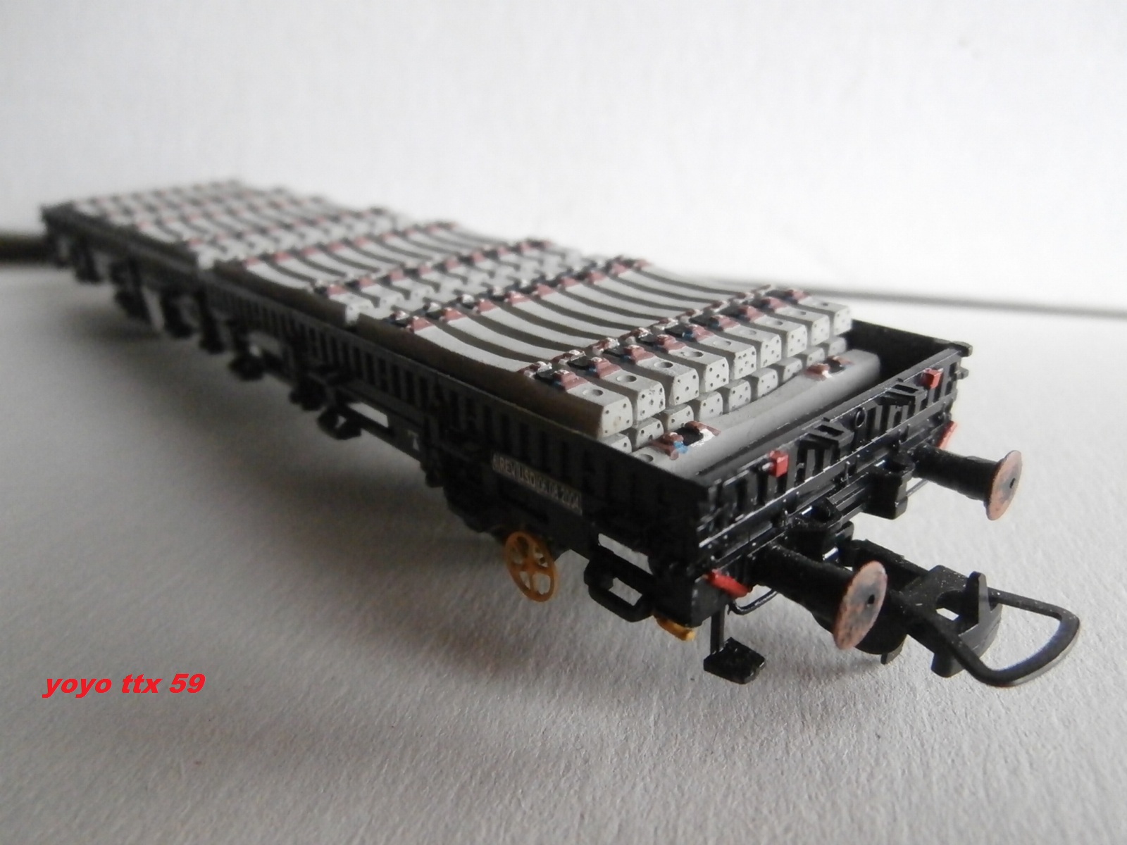 Voici l'une de mes réalisations purement imaginaire , sauf pour le chargement qui lui est bien réel(d'aprés photos).La base du wagon est d'origine Sai(Kibri).Les traverses proviennent de la voie traverses beton code 83 de chez Roco "ref:42401".