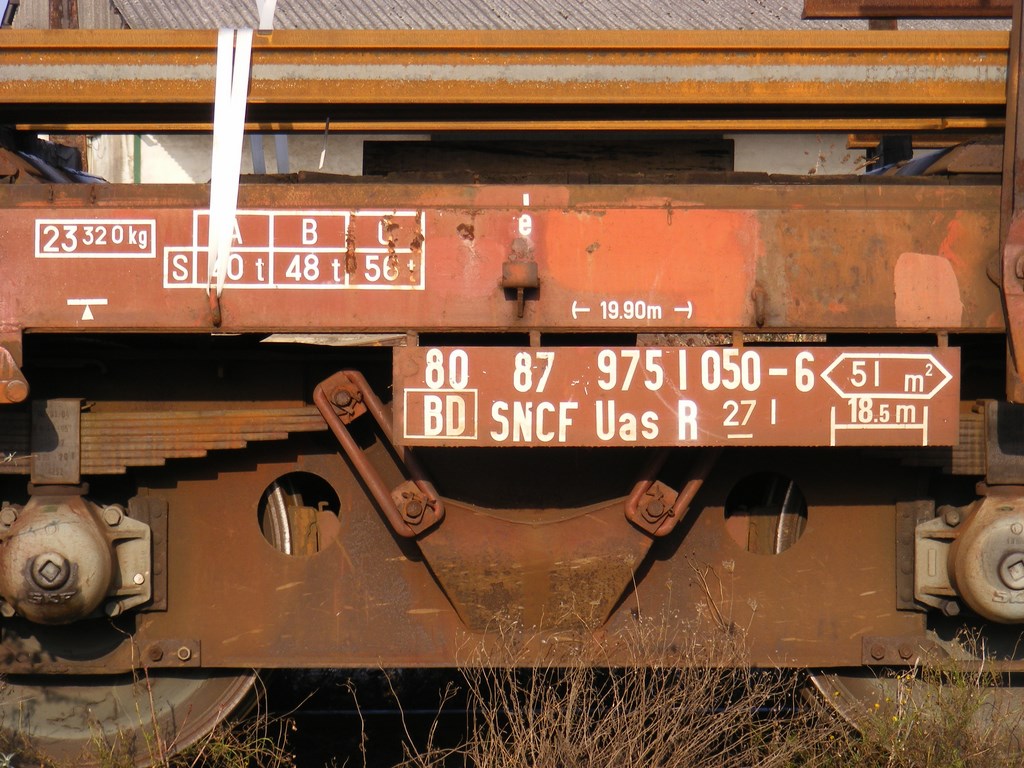 Voici le wagon 80 87 975 1 050-6 Uas R27 1 F SNCF-DJ - point d'attache Saulon