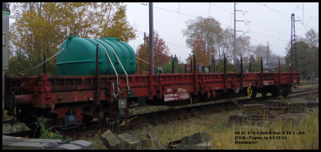 Voici le wagon plat à boggies 80 87 979 4 665-0 Uas R55 6 - F SNCF-RO de la rame "Suite Rapide RVD2"