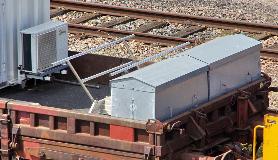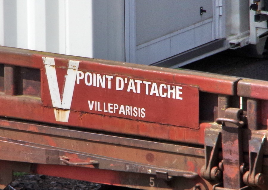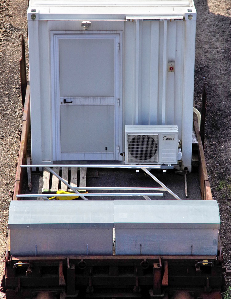 Voici le wagon 80 87 979 4 708-9 Uas R55 6 F SNCF-PN - Point d'attache Villeparisis avec son bungalow de cantonnement photos de Gtr Lefèvre à Tergnier le 15 juillet 2019