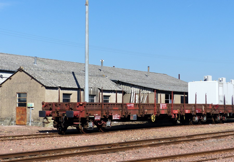 Voici le wagon plat à boggies 80 87 979 4 759-1 Uas R55 6 - F SNCF-TR gare d'attache Saint Pierre des Corps