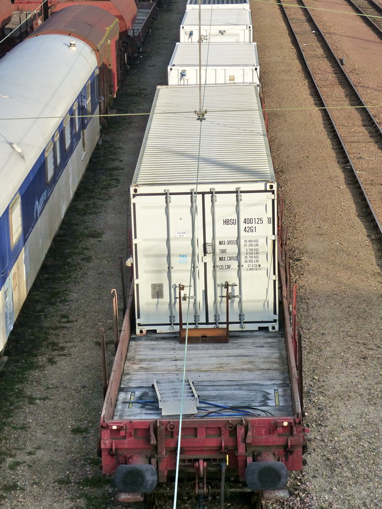 Voici le wagon plat à boggies 80 87 975 0 700-7 Uas R25 6 - SNCF-TR (Train d'hébergement du personnel caténaire gare d'attache Saint Pierre des Corps) Composition de la rame sur la voiture DEV 80 87 979 3 417-7 H55 0 SNCF-TR