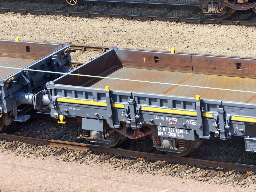 Voici le wagon plat de 18,50 sortant de révision avec une nouvelle livrée