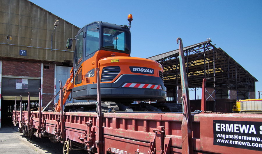 Le wagon 33 87 3945 062-9 Res RIV F-ERSA - ERMEWA avec une Pelle à chenille DOOSAN DX85R pour Transalp remouvellement