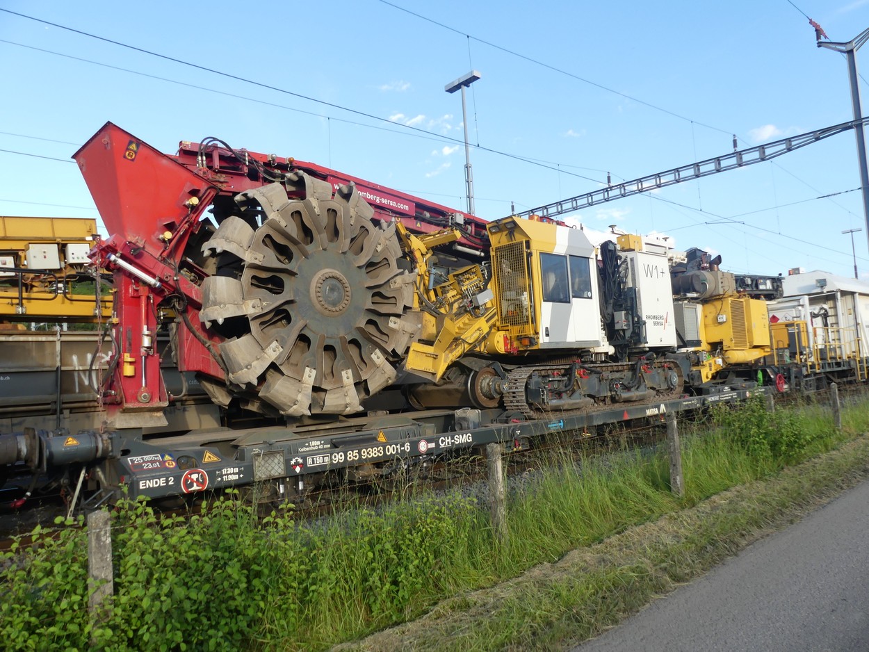 Voici la cribleuse W1+ de Rombherg Sersa Rail Group. Cette machine sur chenille roule également sur rails grâce à des bogies relevables. Elle est transportée sur un wagon surbaissé.