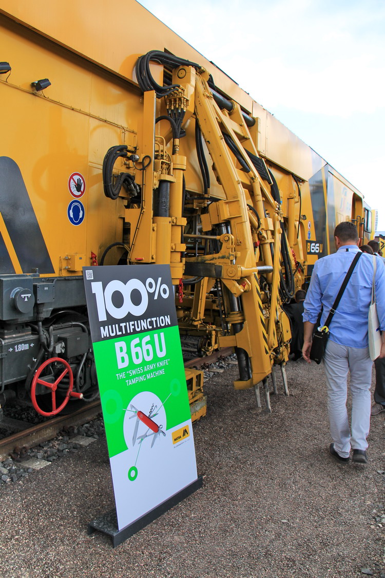 Voici la nouvelle génération de Bourreuse de voies et d'appareils sur le stand de Plasser & Theurer pour l'exposition Ferroviaire IAF Münster 2017 en Allemagne du 30 mai au 01 juin 2017