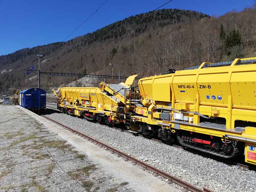 Scheuchzer vient d'acquérir un ensemble de MFS sur chenille, un des MFS est équipé d'une pelleteuse permettant le terrassement de la plateforme et le chargement direct sur MFS, le second MFS sert de tampon en celui de creuse et ceux de voie
