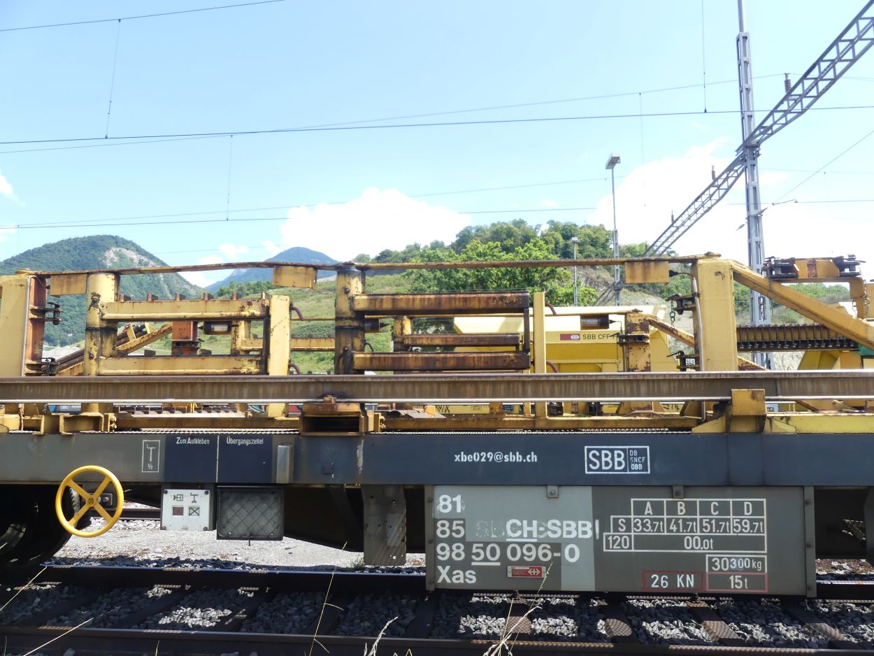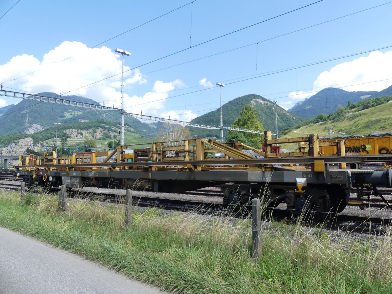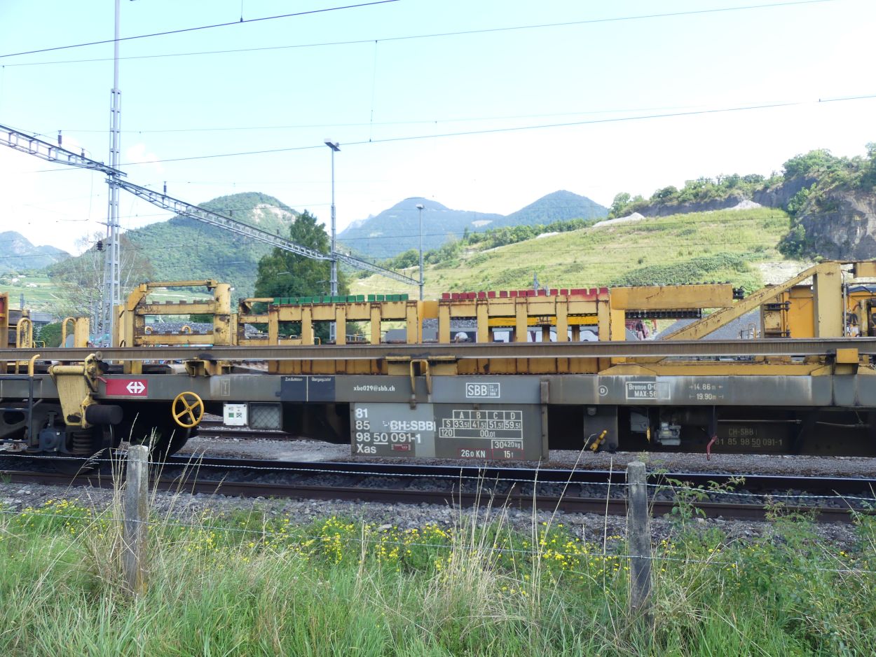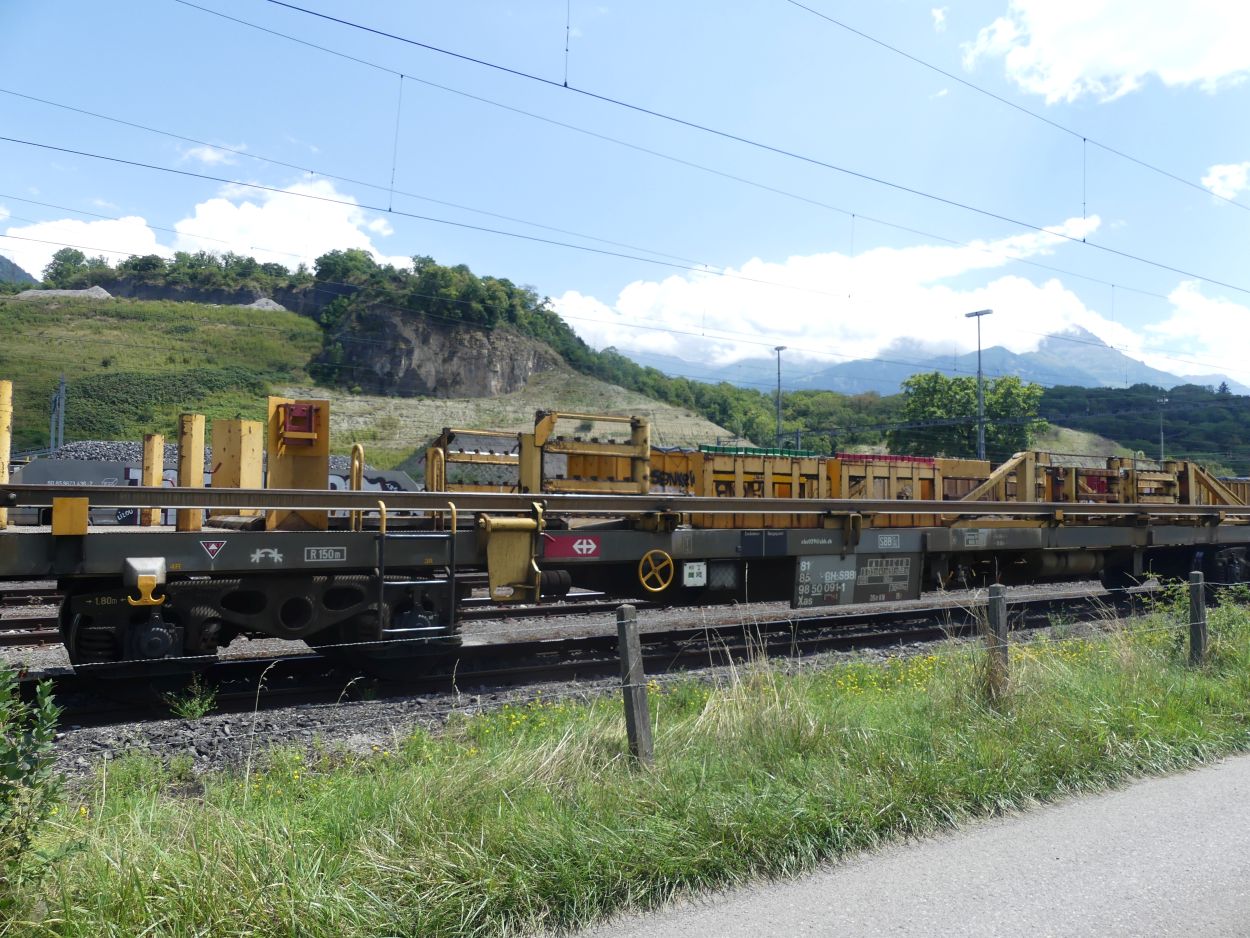 Voici l'un des trains de transport de longs rails de 108 m, numéro 9. Ces trains peuvent transporter des longs rails soudés de 108 m maximum, la longueur utilisée en Suisse.